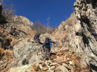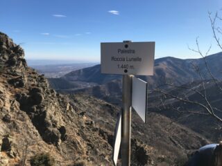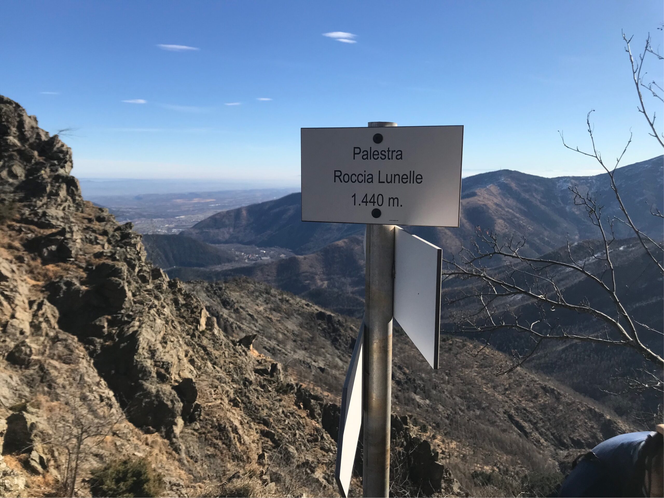 Raggiunta la punta Lunelle e il successivo relativo colle, abbiamo modificato l’anello inoltrandoci verso le palestre di roccia. Qui il sentiero si riduce ad una traccia con sporadici ometti e sbiaditi segni rossi. Si incontrano almeno due canalini molto ripidi, il secondo dei quali ci ha fatto desistere dall’andare oltre, per terreno molto sdrucciolevole e ripido, pur se in condizioni asciutte.