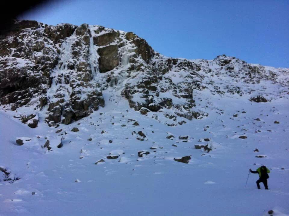 ALTRO: dopo la cascata lunga c’è una candela oltre la quale vi sono due lunghezze di drytooling attrezzate a spit con anello in sosta.