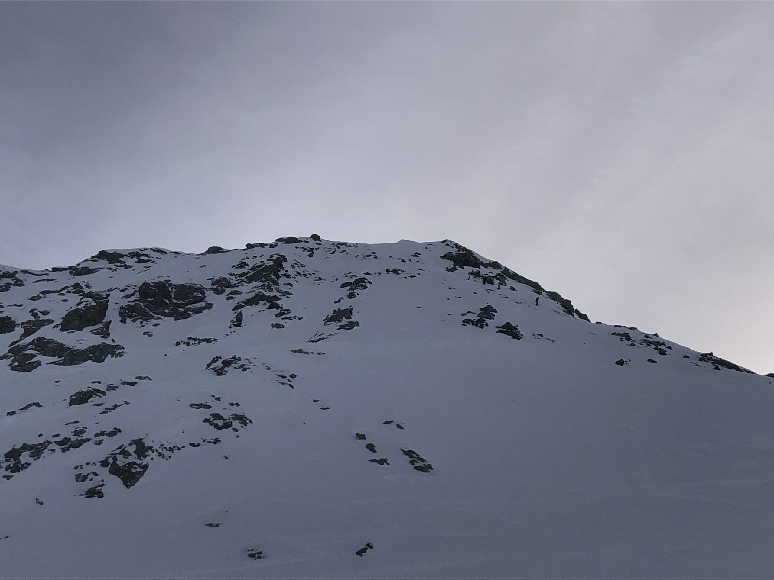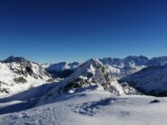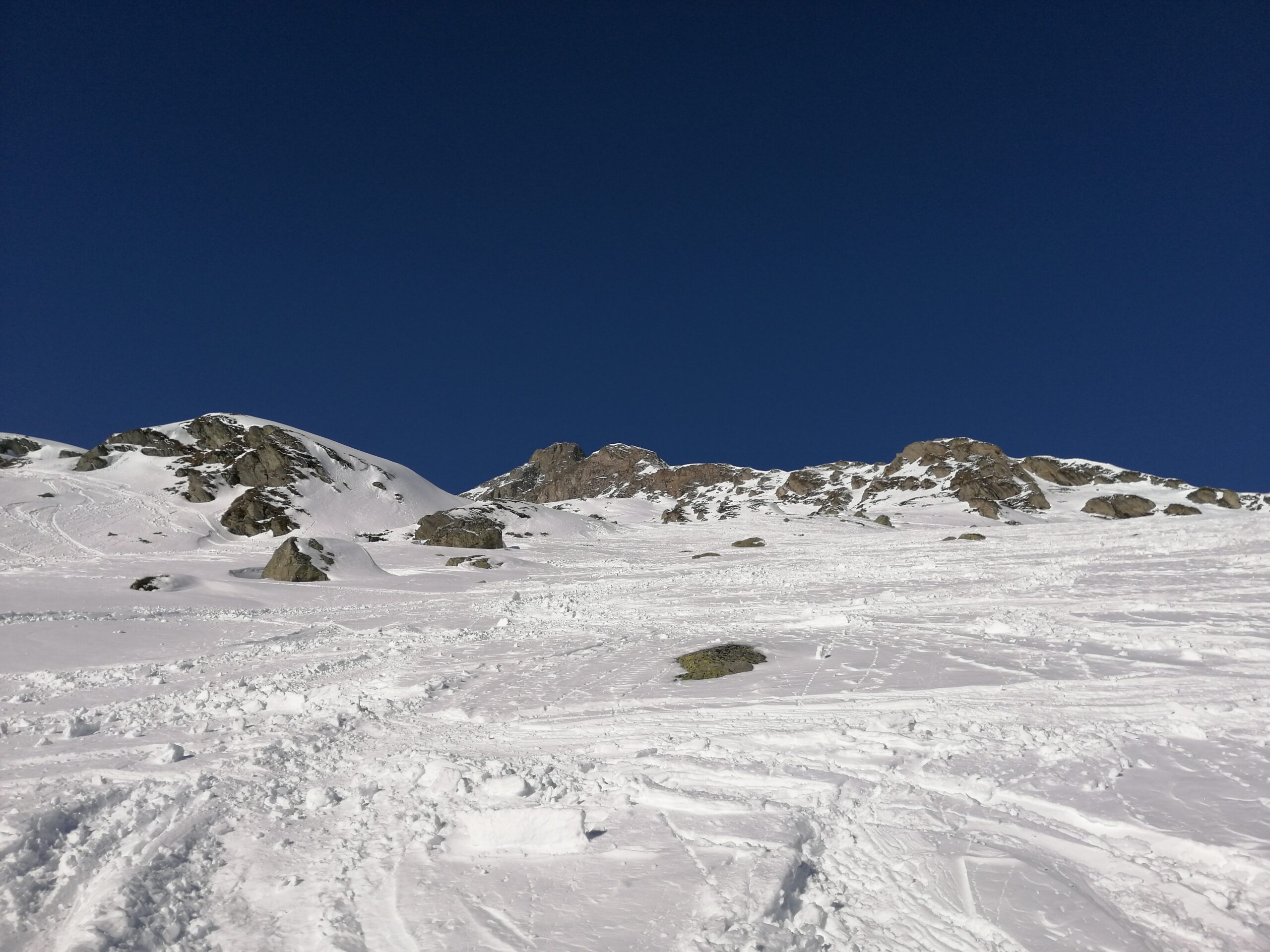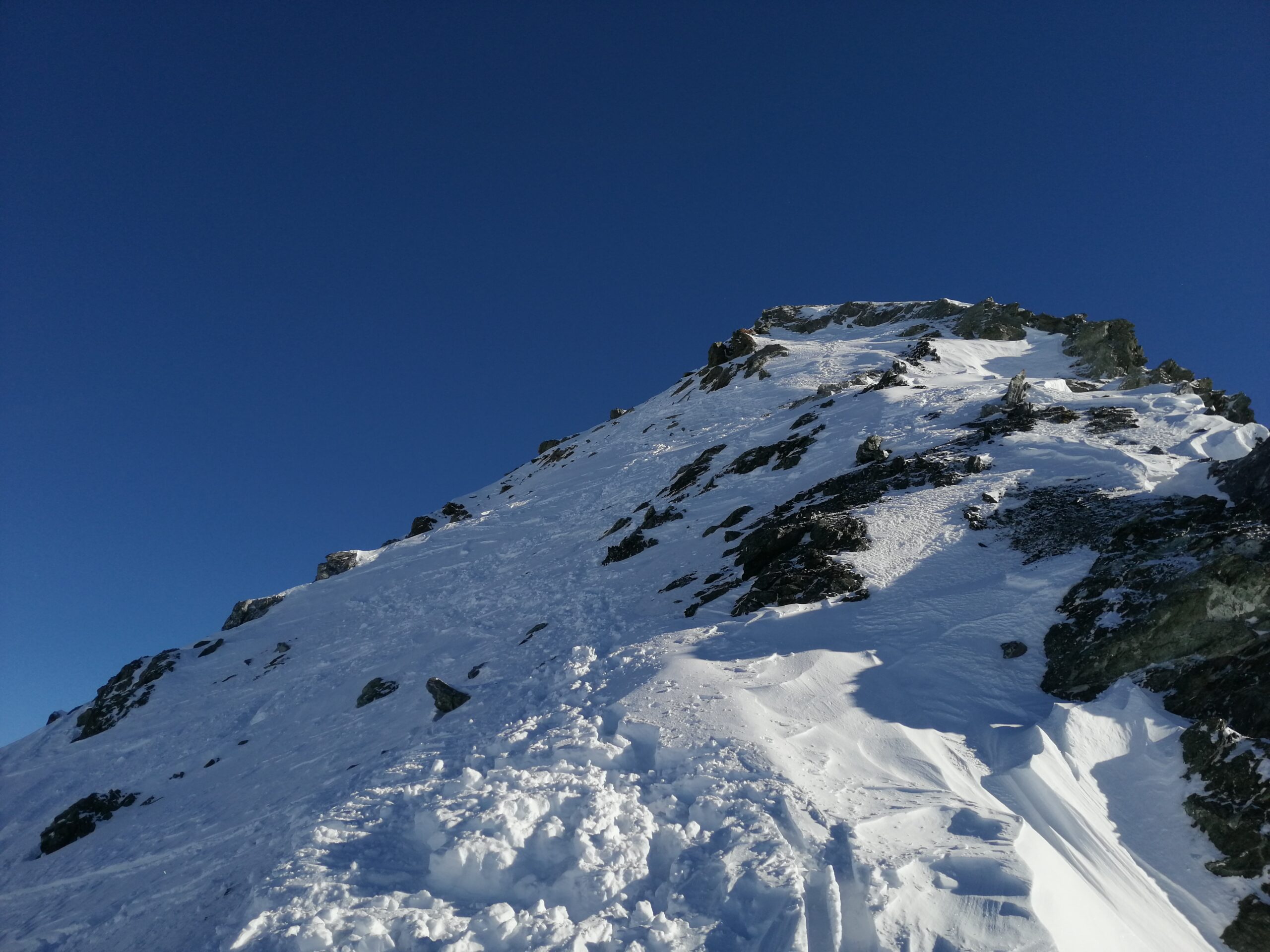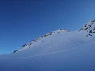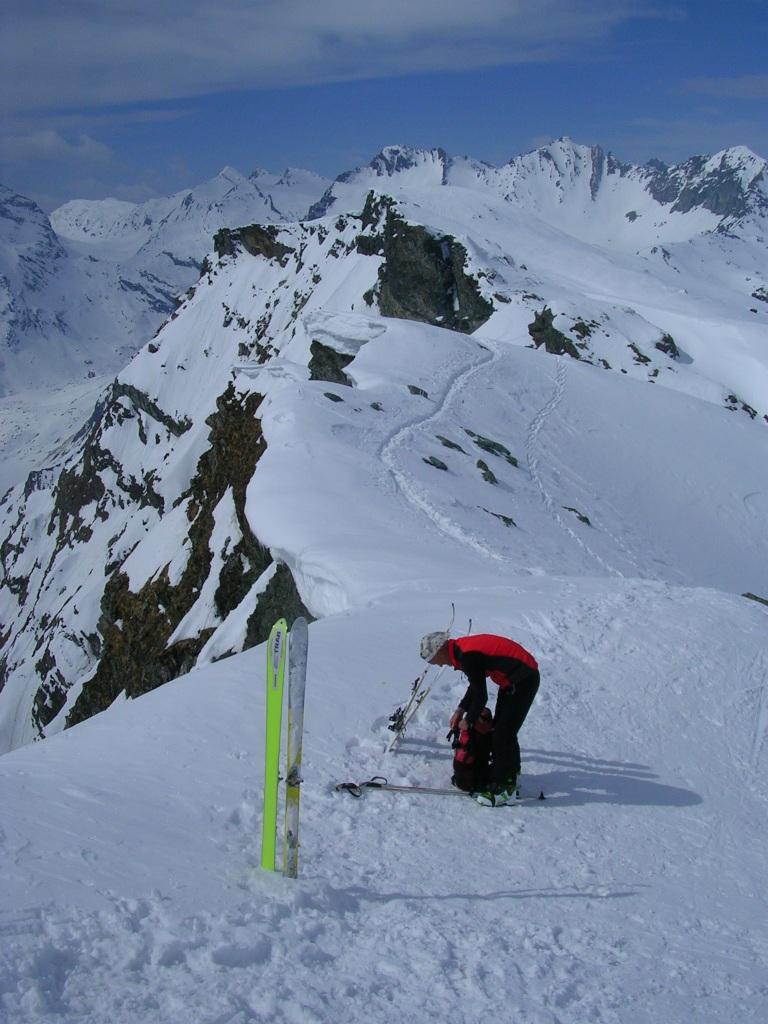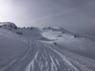 Lo si prende da sin. e quindi con una diagonale alta fino al suo spigolo di Dx. Qui si lasciano gli sci ed a piedi si raggiunge in pochi minuti la vetta.