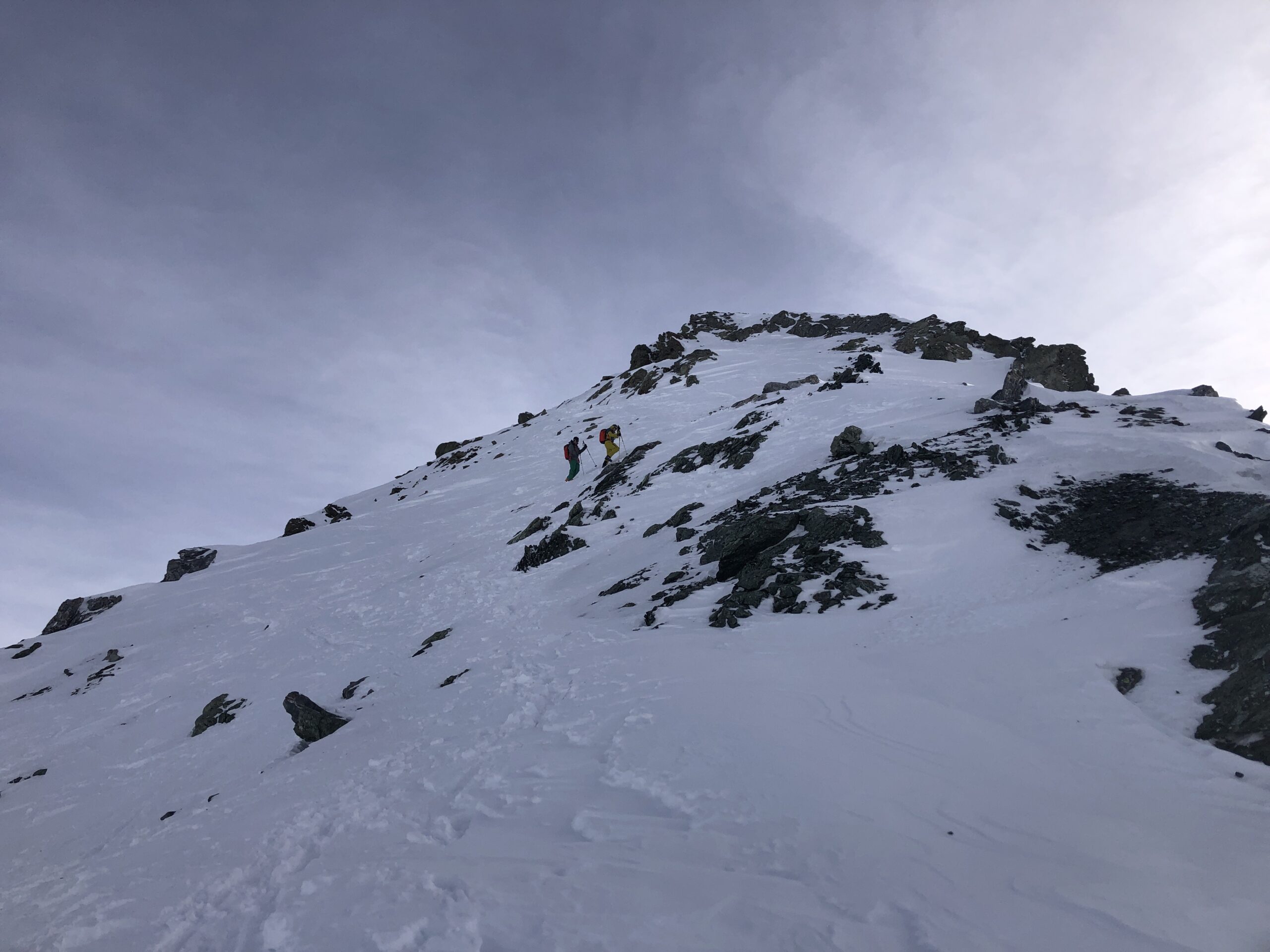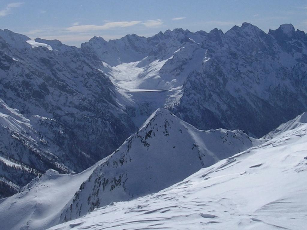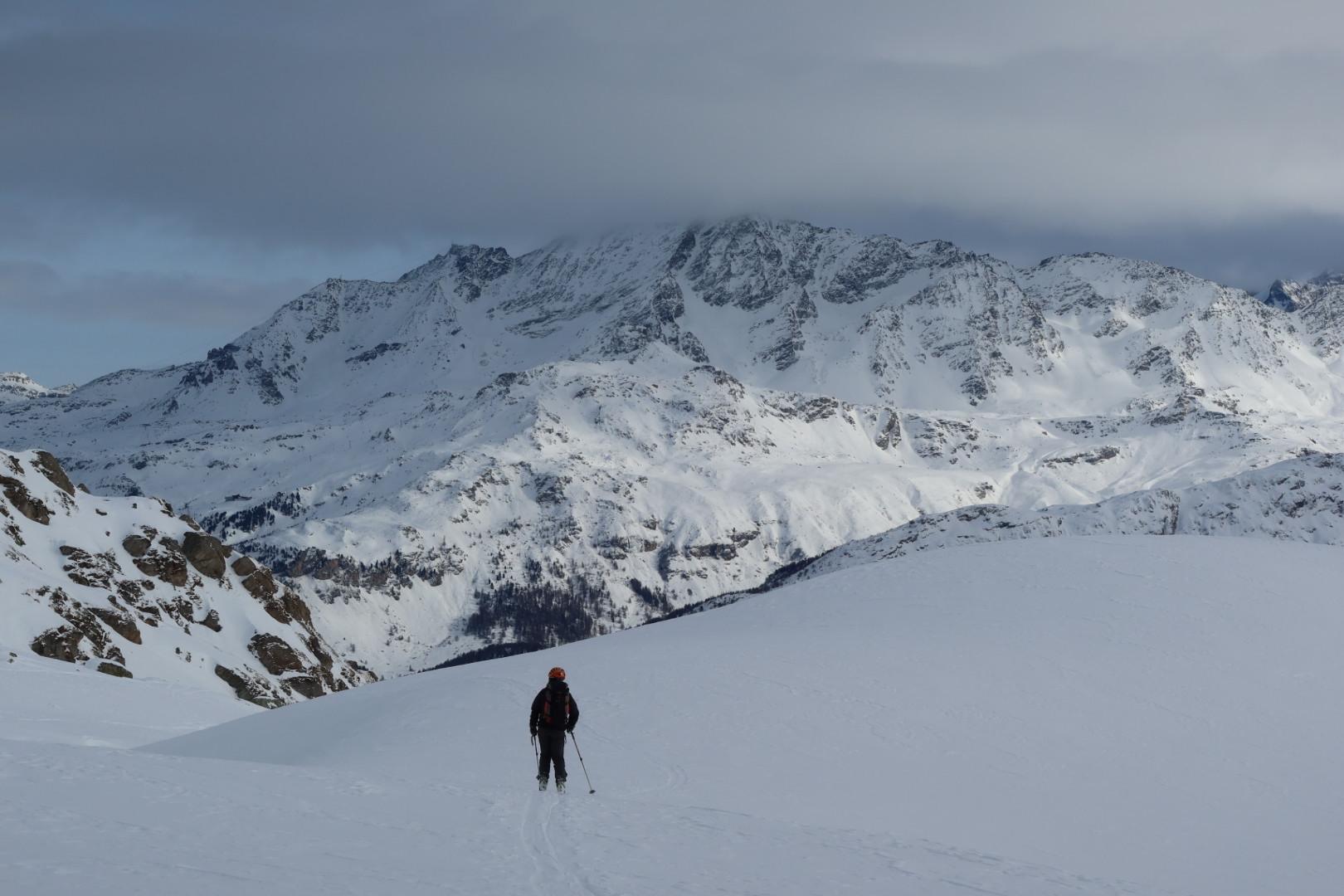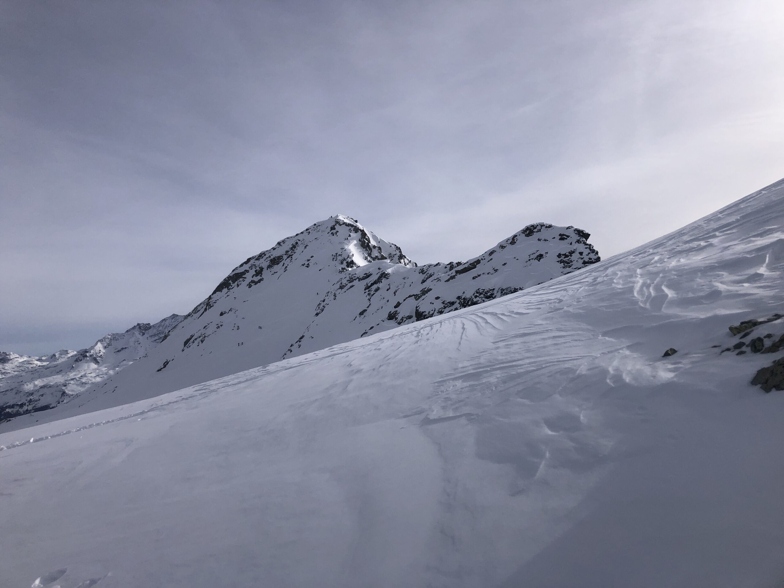 Lo si prende da sin. e quindi con una diagonale alta fino al suo spigolo di Dx. Qui si lasciano gli sci ed a piedi si raggiunge in pochi minuti la vetta.