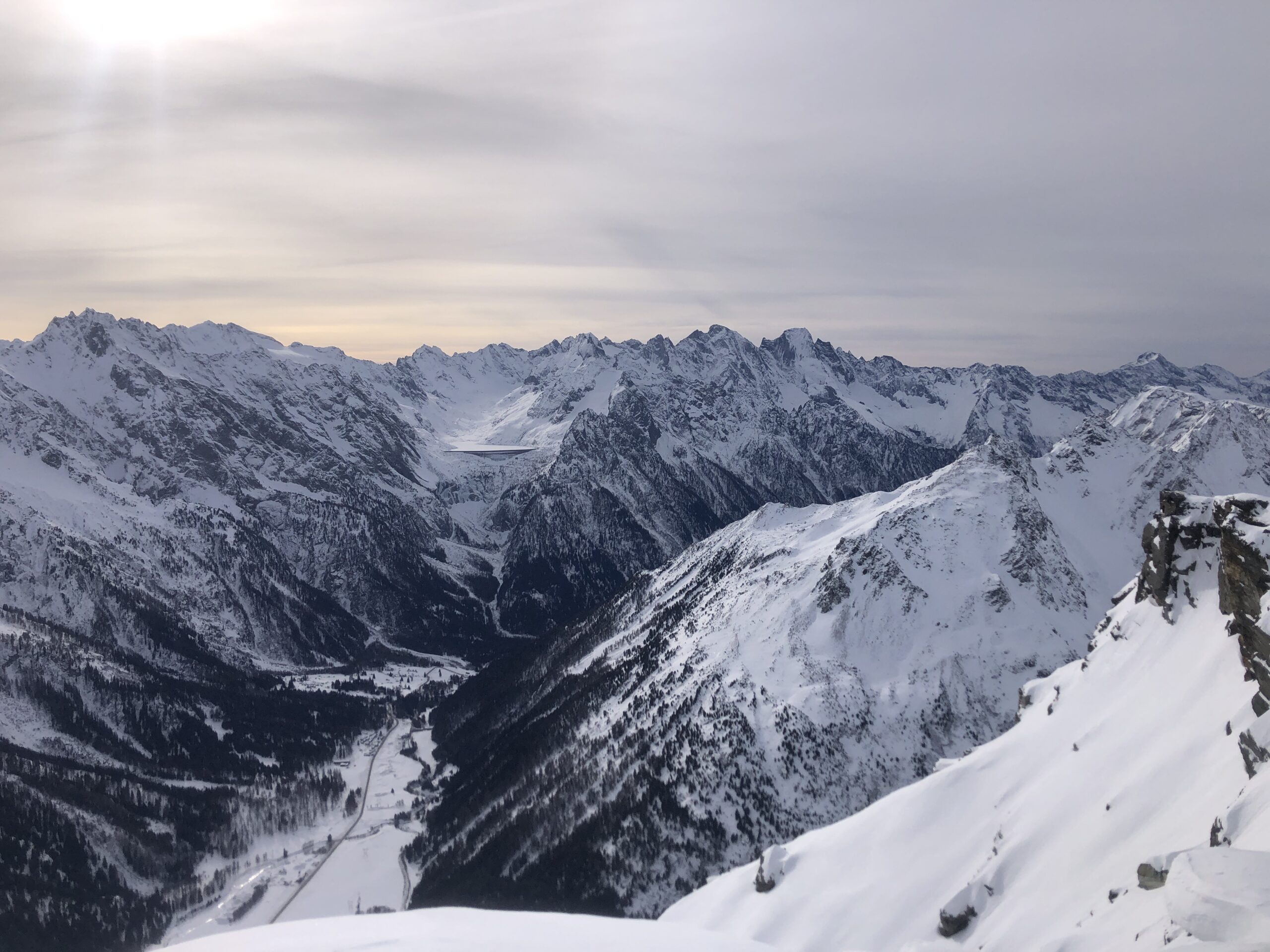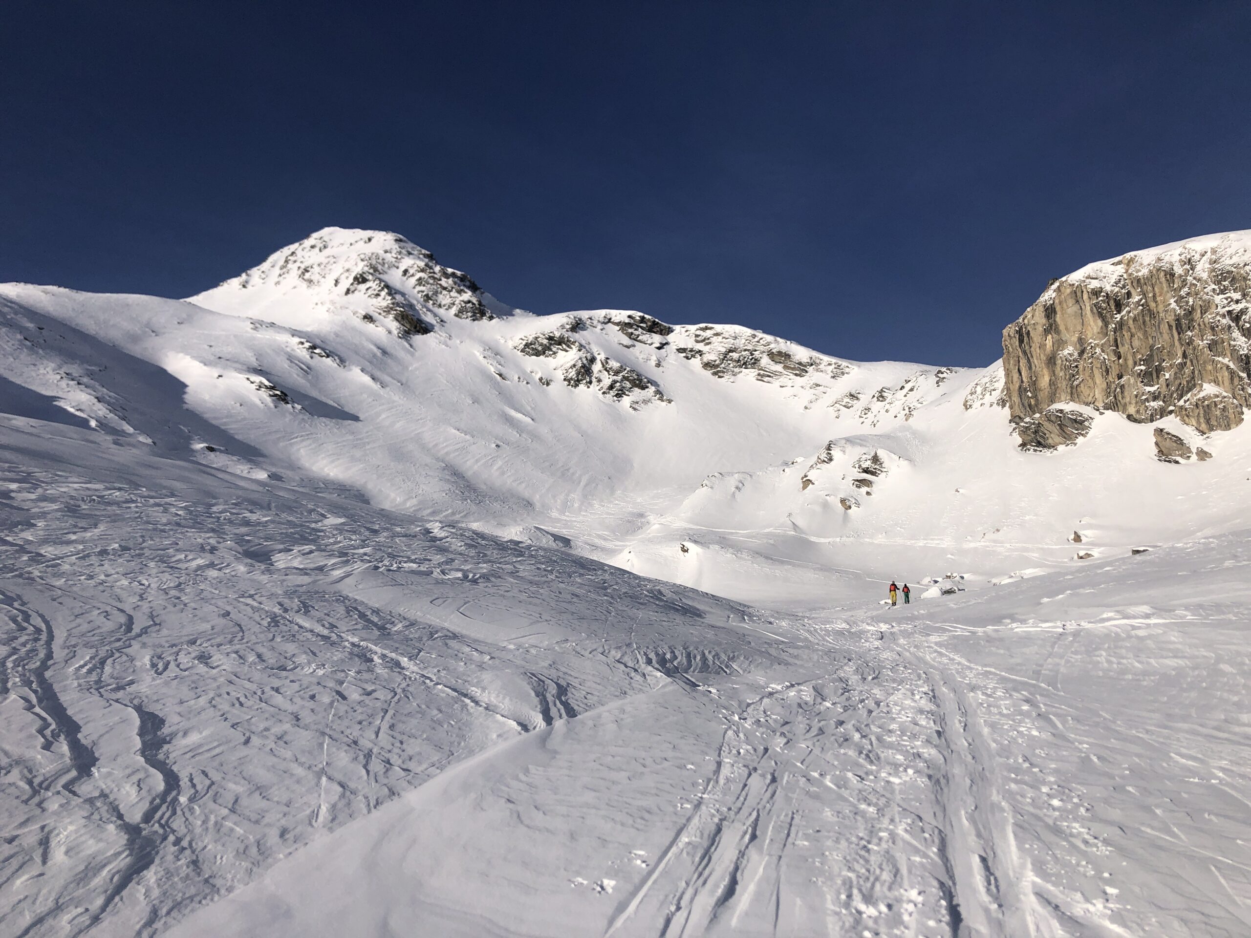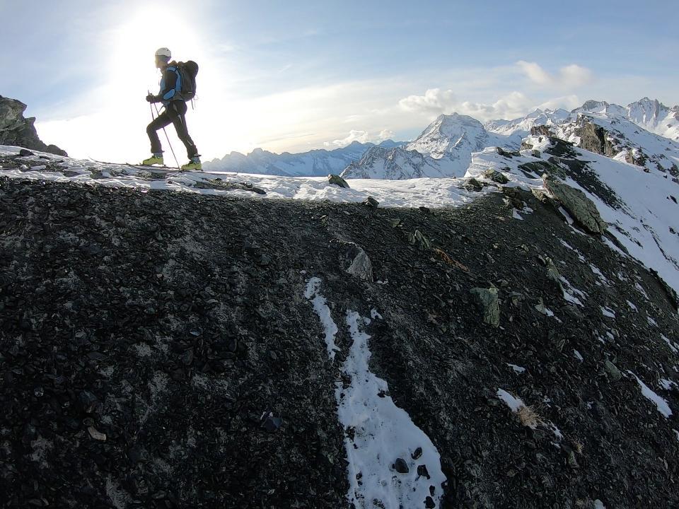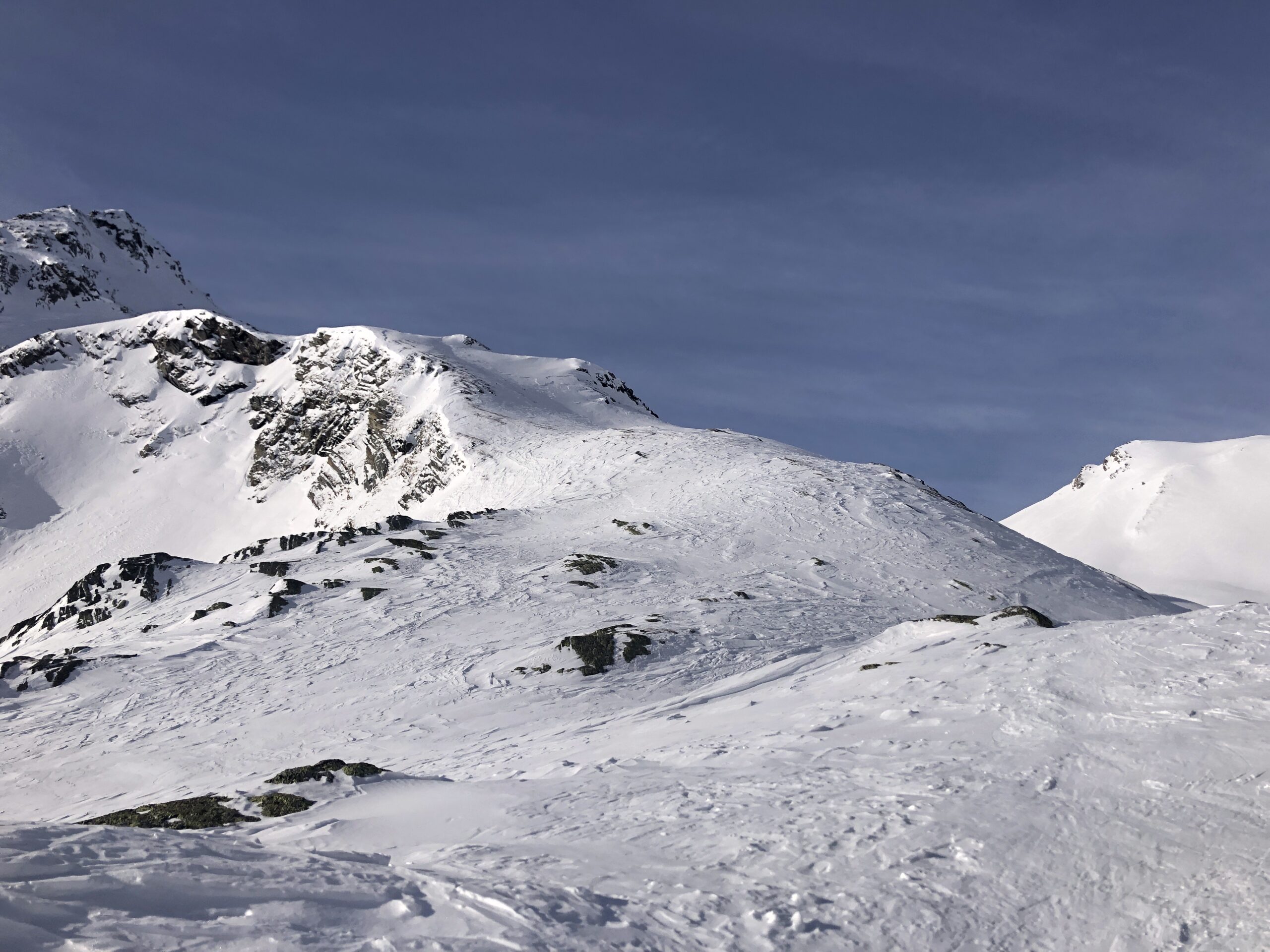 Lo si prende da sin. e quindi con una diagonale alta fino al suo spigolo di Dx. Qui si lasciano gli sci ed a piedi si raggiunge in pochi minuti la vetta.
