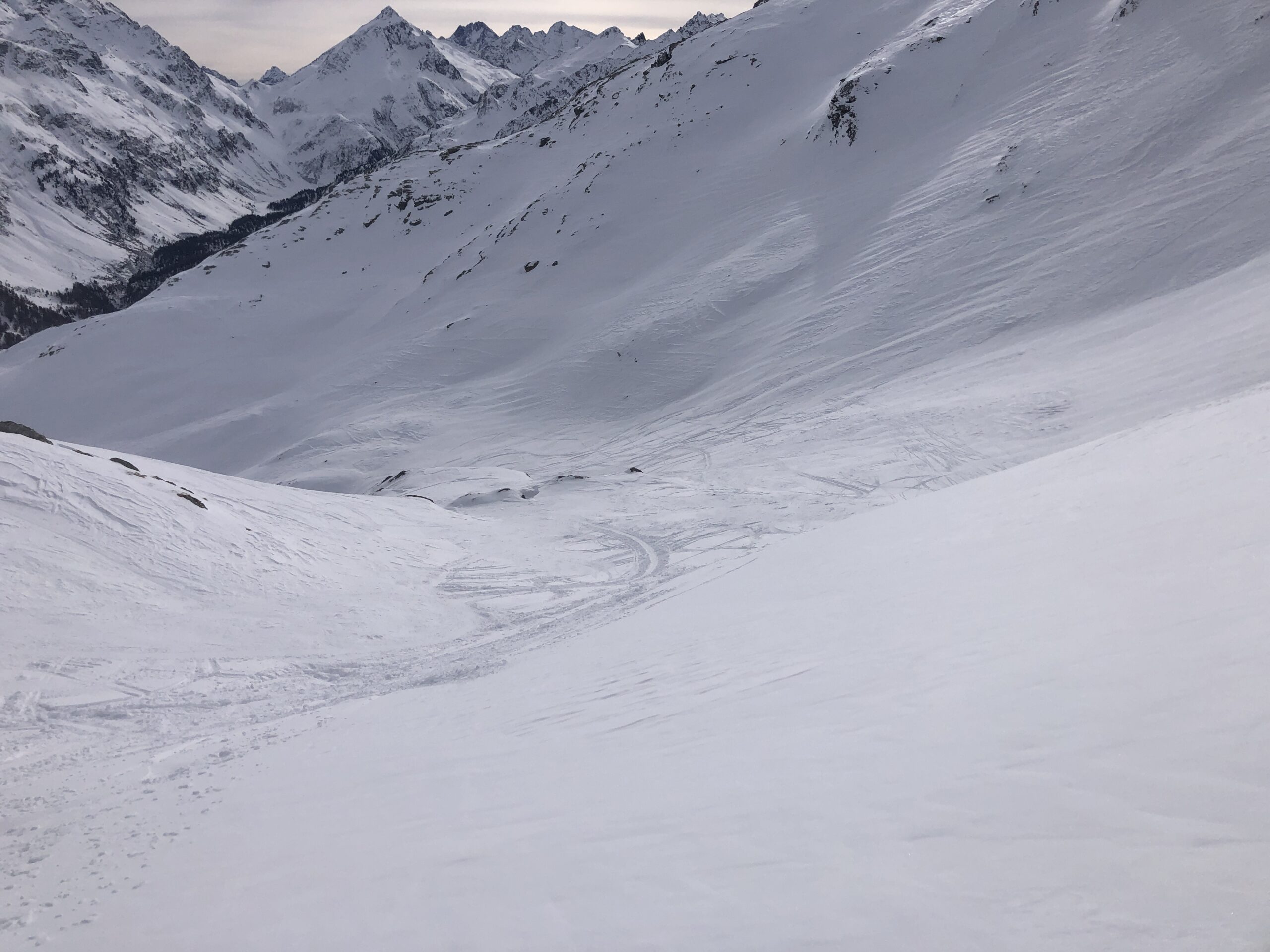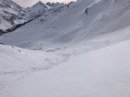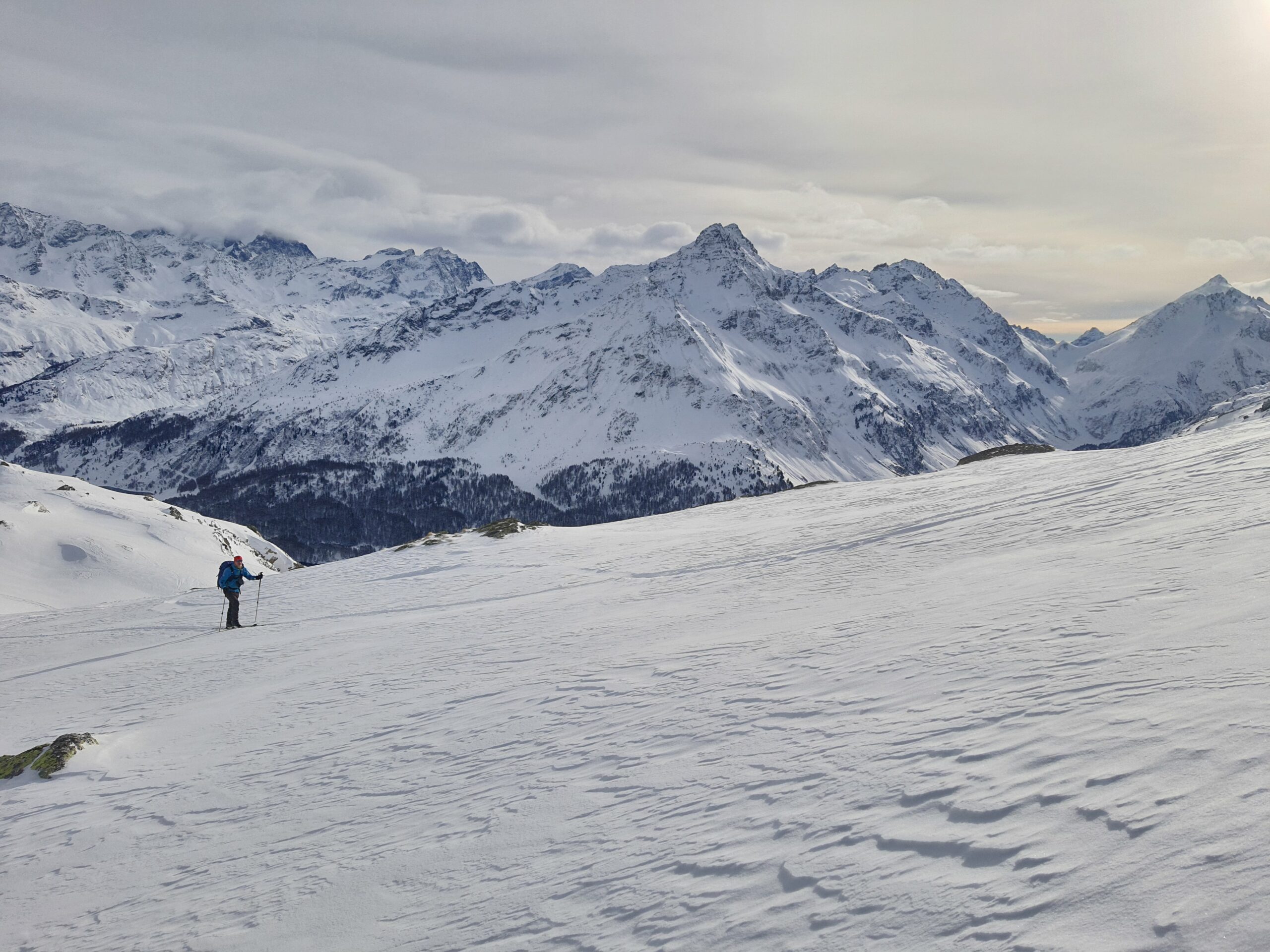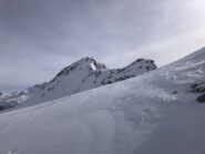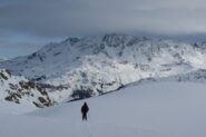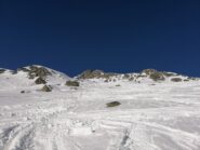 Dal versante SE si passa decisamente a N, dirigendosi verso il Pass Lunghin fin sotto il pendio finale.