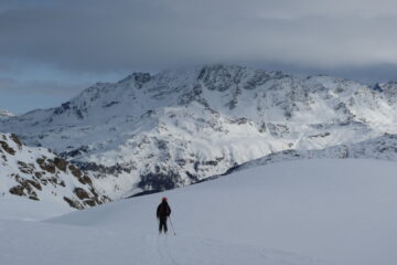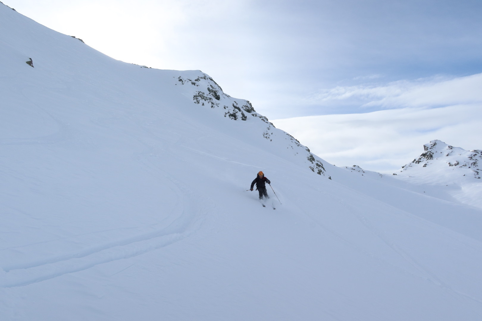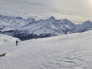 5-10 cm di neve fresca fin dalla partenza, più si sale e più aumentano. Vento presente sempre fin dalla partenza, che va quasi a sparire appena si entra nella conca a metà gita, per poi tornare abbastanza forte im cima. Discesa: avvenuta su neve polverosa x tutto l’itinerario..semplicemente meravigliosa. Ps consiglio almeno i ramponi x la cima