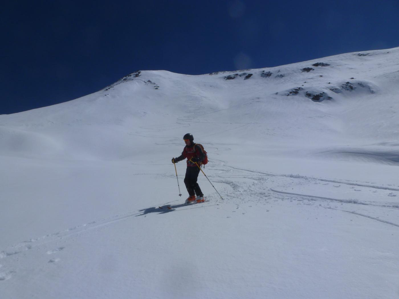 È proprio vero, le gite al fondo della val Troncea, non sono gite, sono viaggi iniziatici. Partenza da Pattemouche alle 7, arrivo all’alpe Mey verso le 9,15 dopo 8km di pista da fondo; proseguimento lungo il vallone fino a 2250m, altri 2km e fanno 10. Salita nel canale ripido fino a 2400m con i ramponi (canale stretto in un paio di punti (40°). Guardia parco ci sorpassa e segue la via diretta senza passare dal colle. Lo seguiamo, la neve che fin qui era durissima trasformata, ora è ricoperta da 10-15cn di polvere che andrà benissimo in discesa ma fa scivolare sui pendii ripidi diretti. Arrivo in punta verso le 12,30 con poco spazio per le manovre, dopo 13,5km in totale. Giornata spaziale, sarebbero da salire tutte le cime (Appenna, Pignerol, ecc.) Discesa su polvere (10-15cm) su fondo duro fino a 2450m, 50m di crosticina lieve fino a 2400m, poi firn fino all’alpe Mey 2000. Che dire? Sole a palla e temperatura fresca ma senza vento.