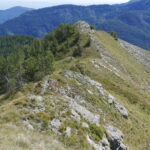 Aggirato il primo ostacolo roccioso sul versante ovest, bisogna immediatamente salire in cresta superando una facile placca dove si usano le mani (I). La cresta è ben camminabile e priva di reali ostacoli, ma è piuttosto aerea ed a tratti affilata e richiede una certa attenzione anche per l’eventuale presenza di detrito sulle rocce scistose. Il percorso è pressochè orizzontale fino al punto culminante spostato verso sud-ovest.