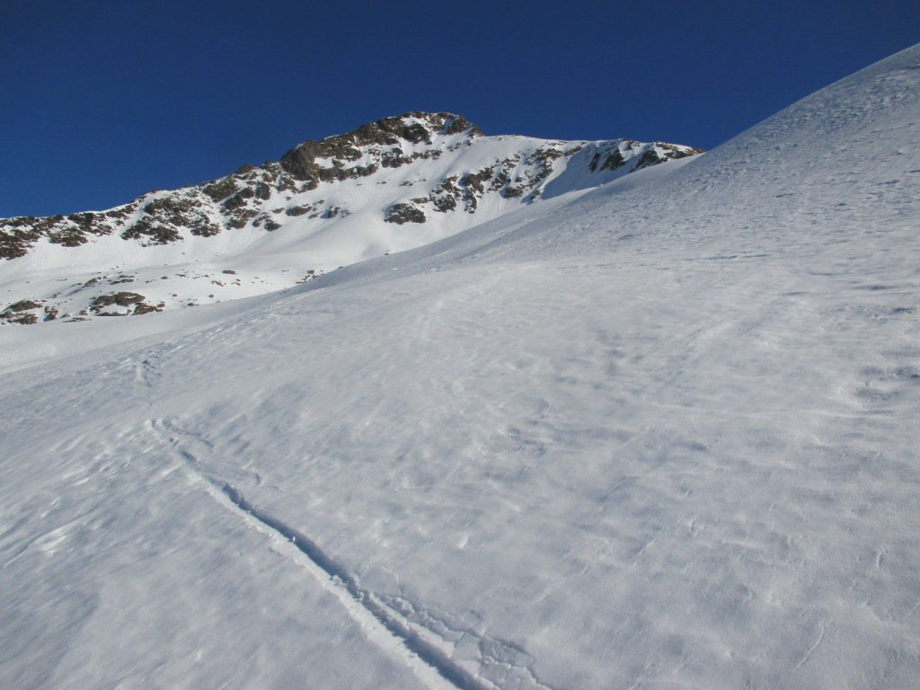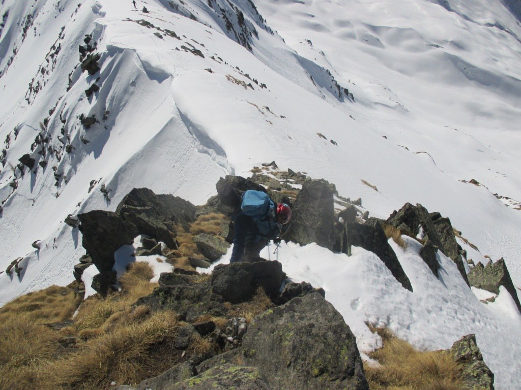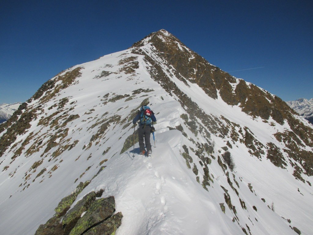 L’ultimo tratto di cresta diventa ripido, con qualche roccetta, ed un poco esposta (utili ramponi), poi spiana e si assottiglia, fino a raggiungere la piccola croce di vetta.