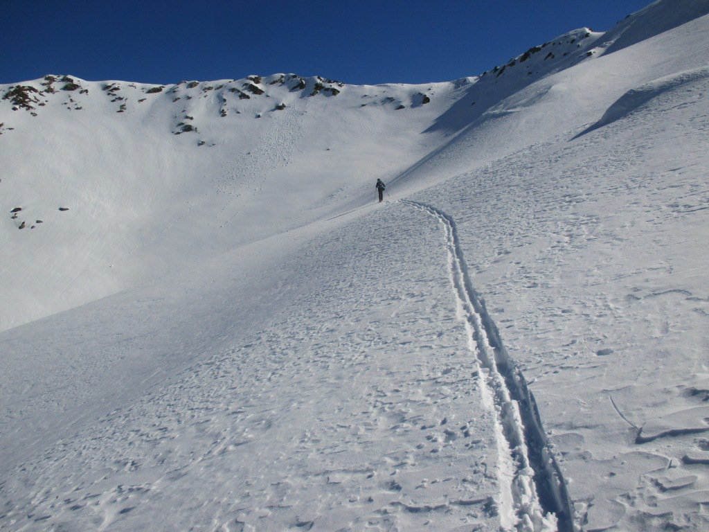 Si prosegue per il valloncello su terreno con poca pendenza, fino al pendio finale che diviene piu’ ripido e porta al Passo. Da questo si percorre a piedi la cresta sud della Cima dei Lupi (utili i ramponi), fino a raggiungerne la larga e pianeggiante cima.