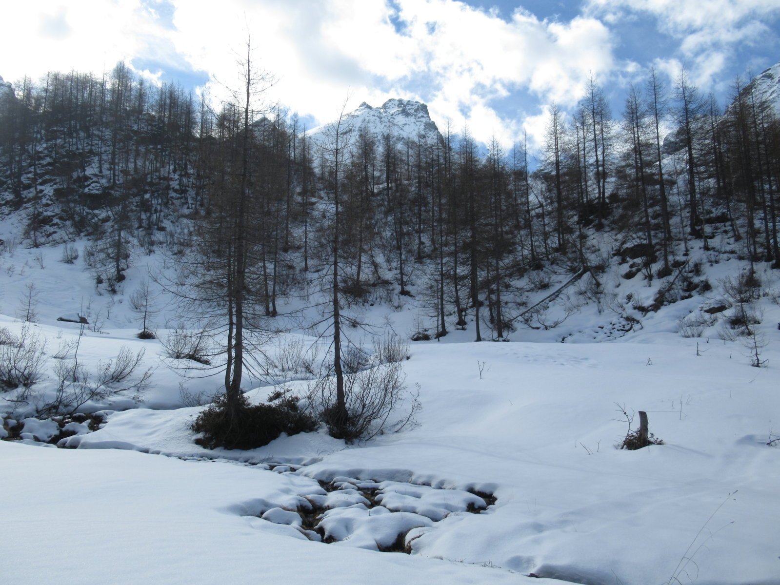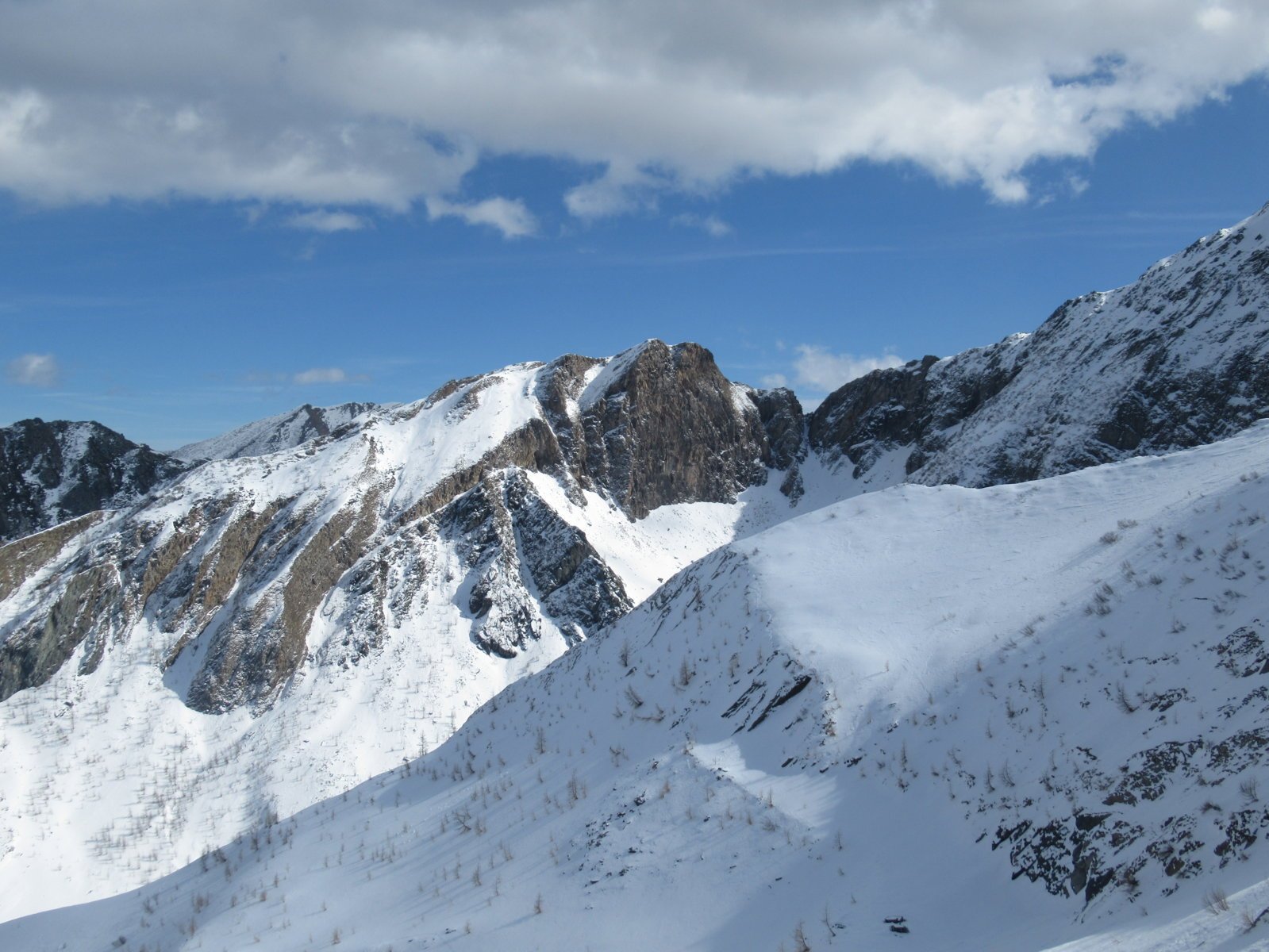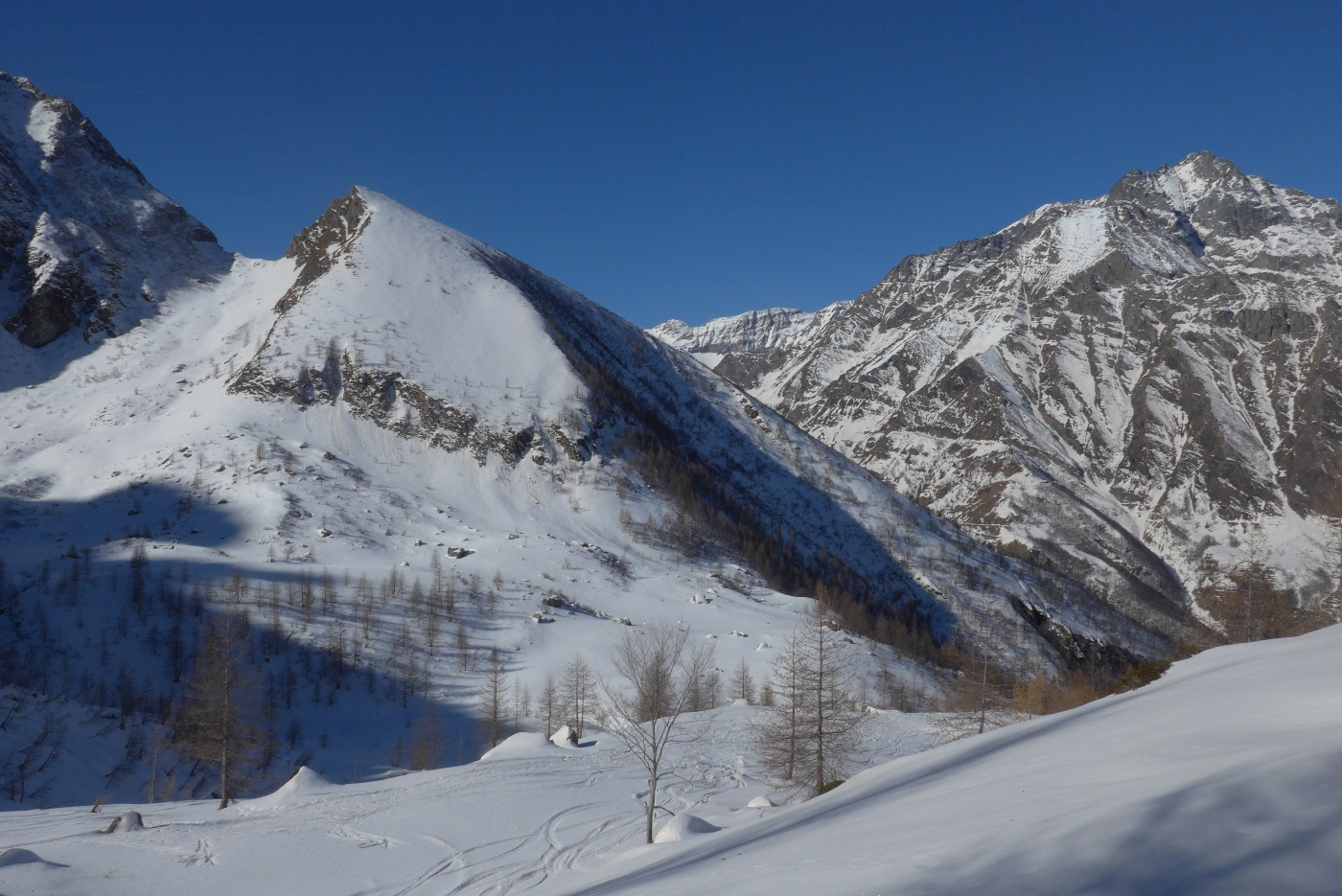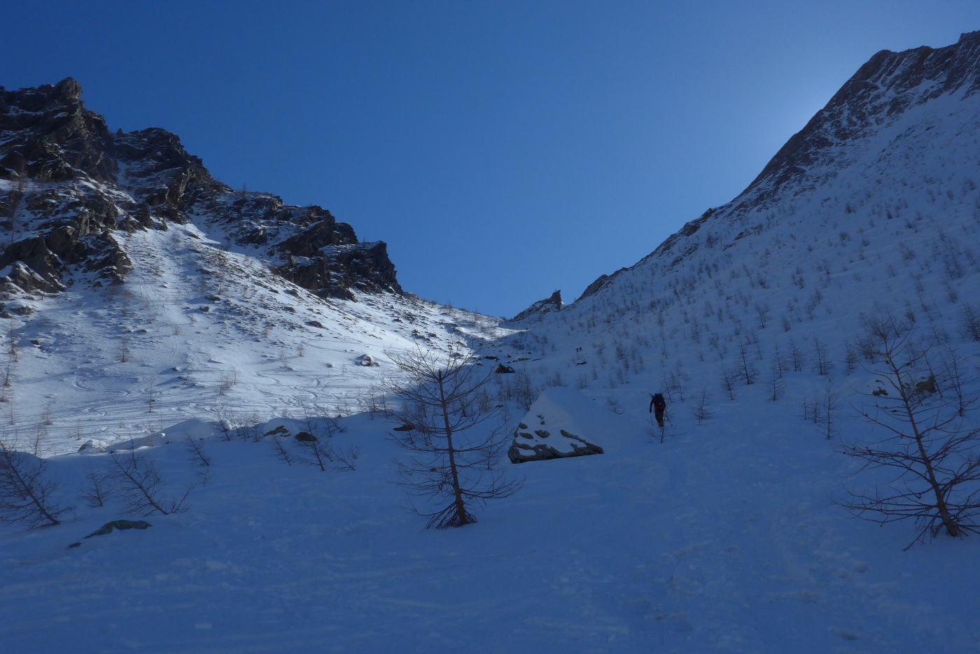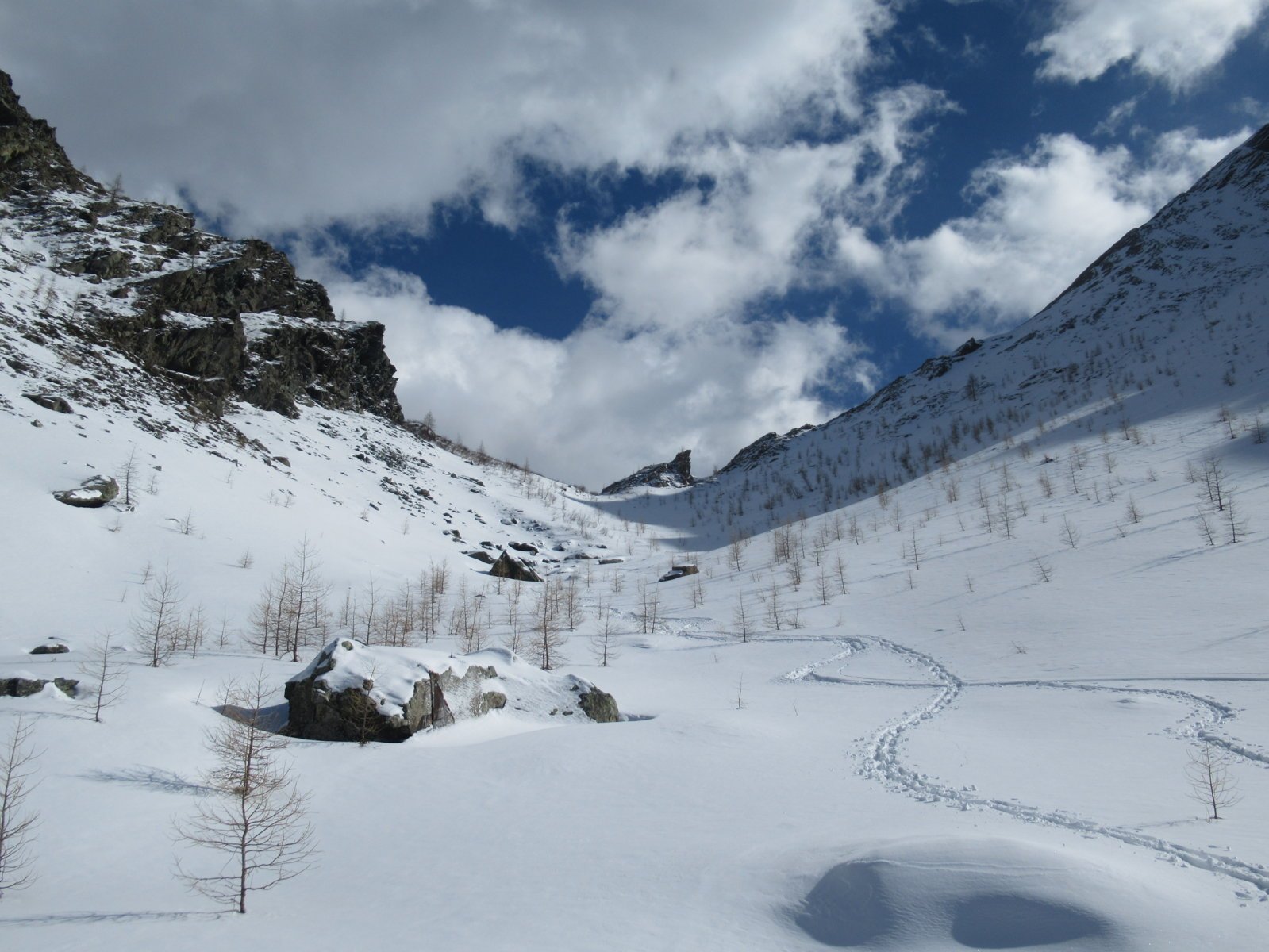 Solo con neve assestata e sicurissima si può fare un anello con discesa su Benot, anche questo BR nel primo tratto.