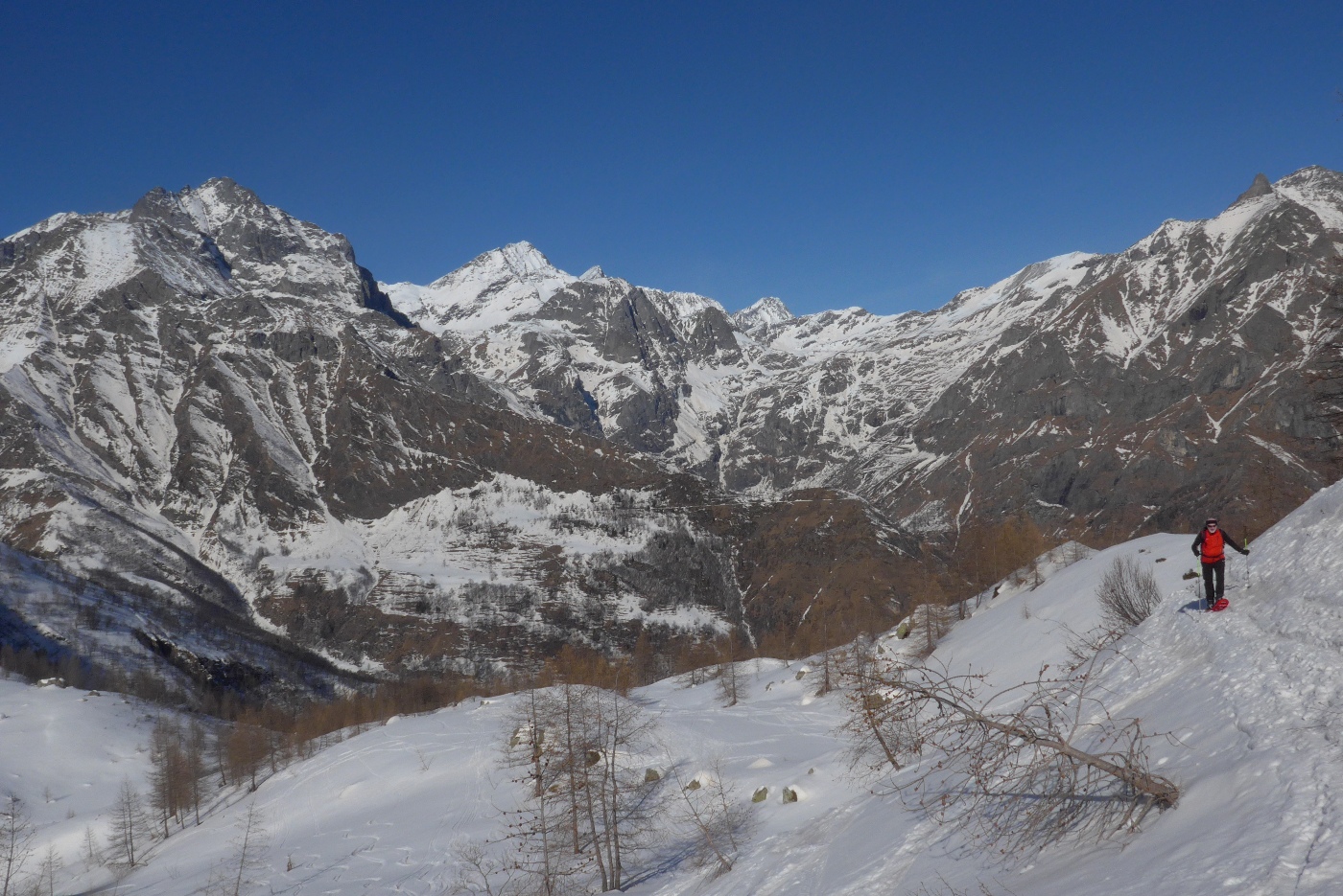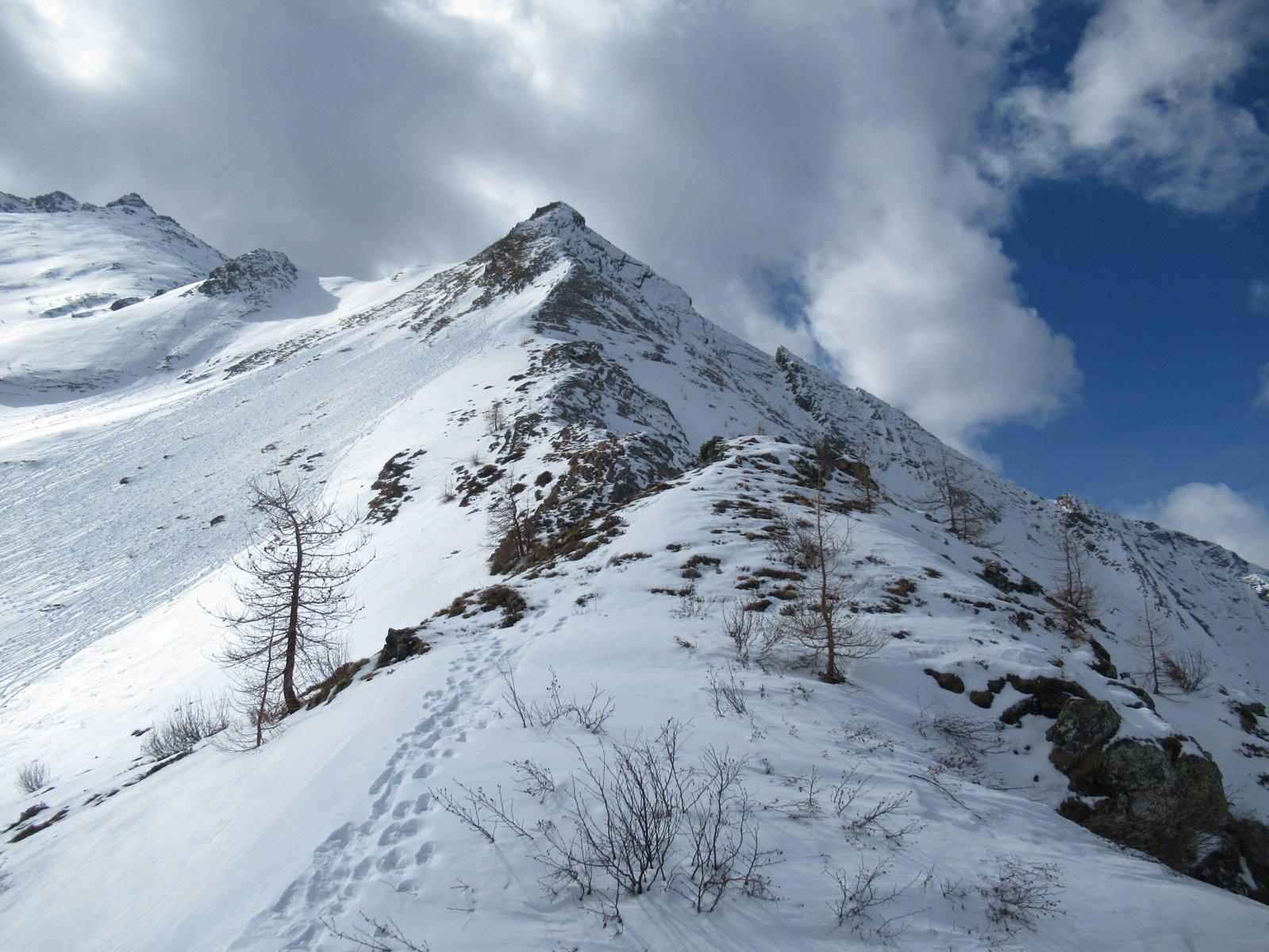 Dal tornante ci si incammina in piano verso l’Alpe Traverset. Raggiuntala, salire verso sinistra in mezzo al bosco, seguendo i cartelli dell’itinerario con racchette. Dopo un tratto un po’ ripido da affrontare sulla destra si raggiunge Pian Lunella. Da qui si nota chiaramente in direzione sud-est il largo canalone che conduce al colle, lungo il quale si sale con pendenze notevoli nell’ultimo tratto.