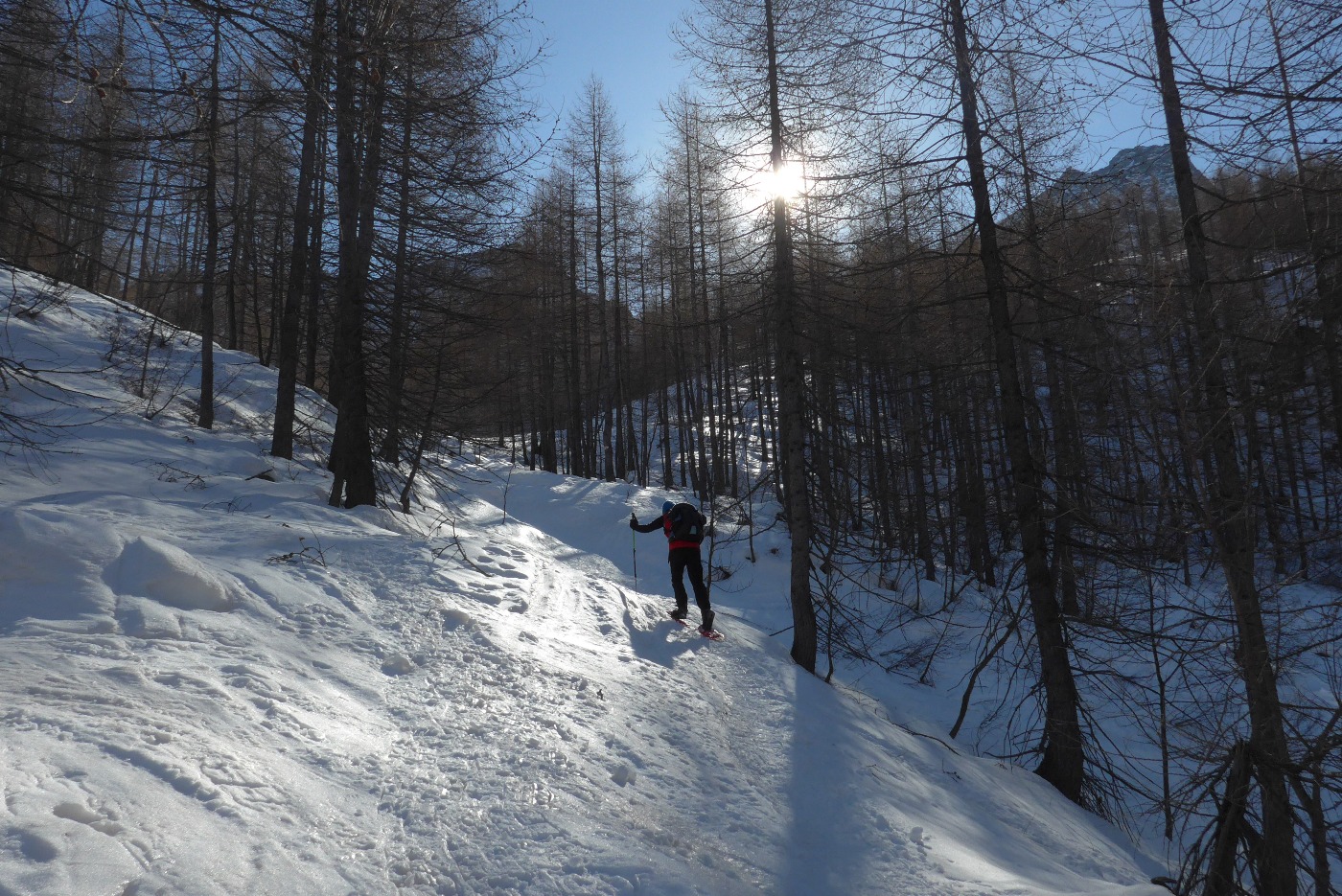 Primo tratto di discesa da percorrere con cautela e possibilmente con ramponcini, vista la neve parecchio dura e la pendenza accentuata .