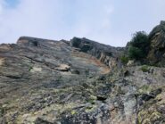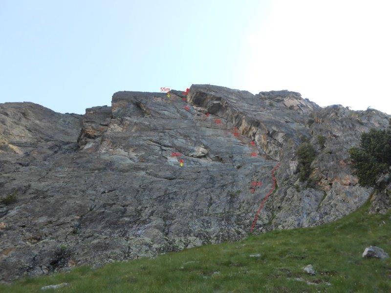 L1: 6b, fessurino tecnico. L2: 6c, completamente a incastro di mano e pugno. L3: 6c, dulfer, incastri e traverso in discesa per arrivare in sosta. L4: 6c, partenza delicata in placca poi diedro verticale. L5: 6a, tetto boulder poi facile fino in cima.