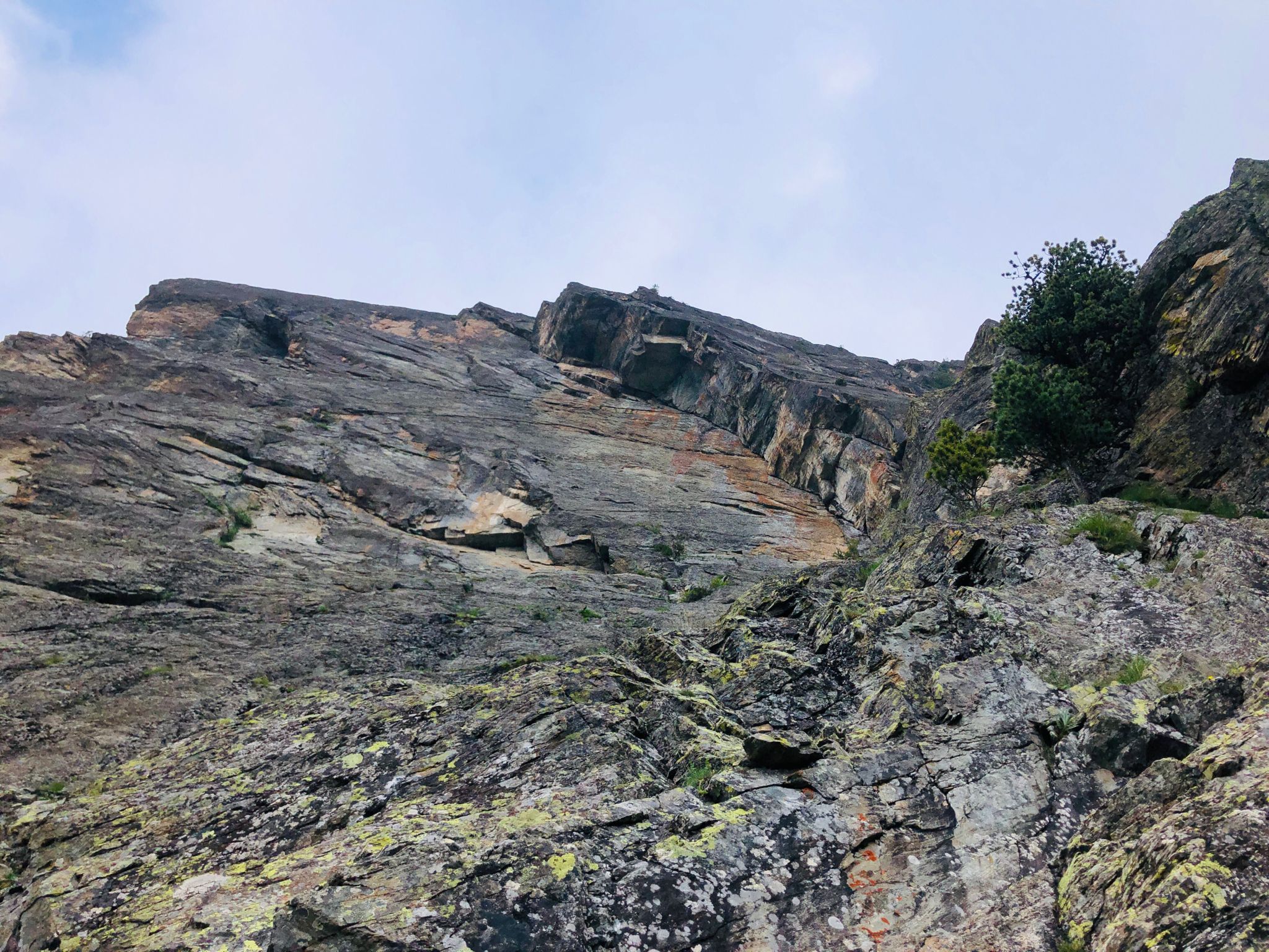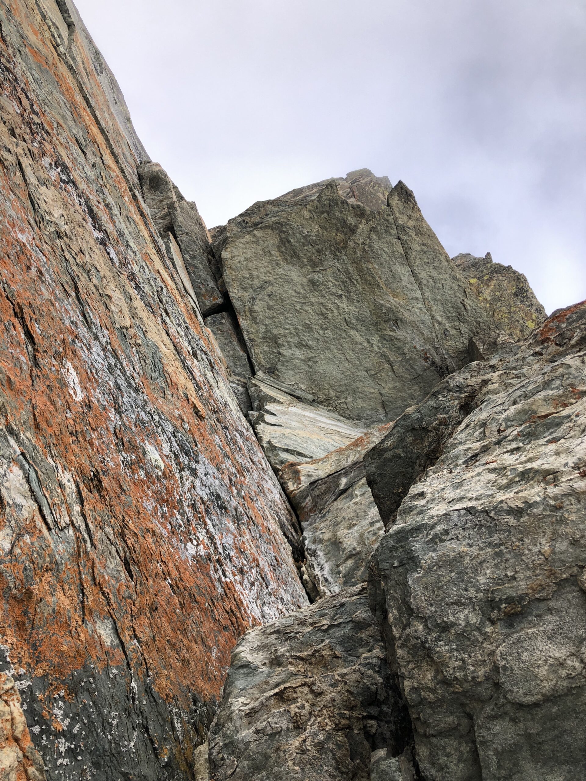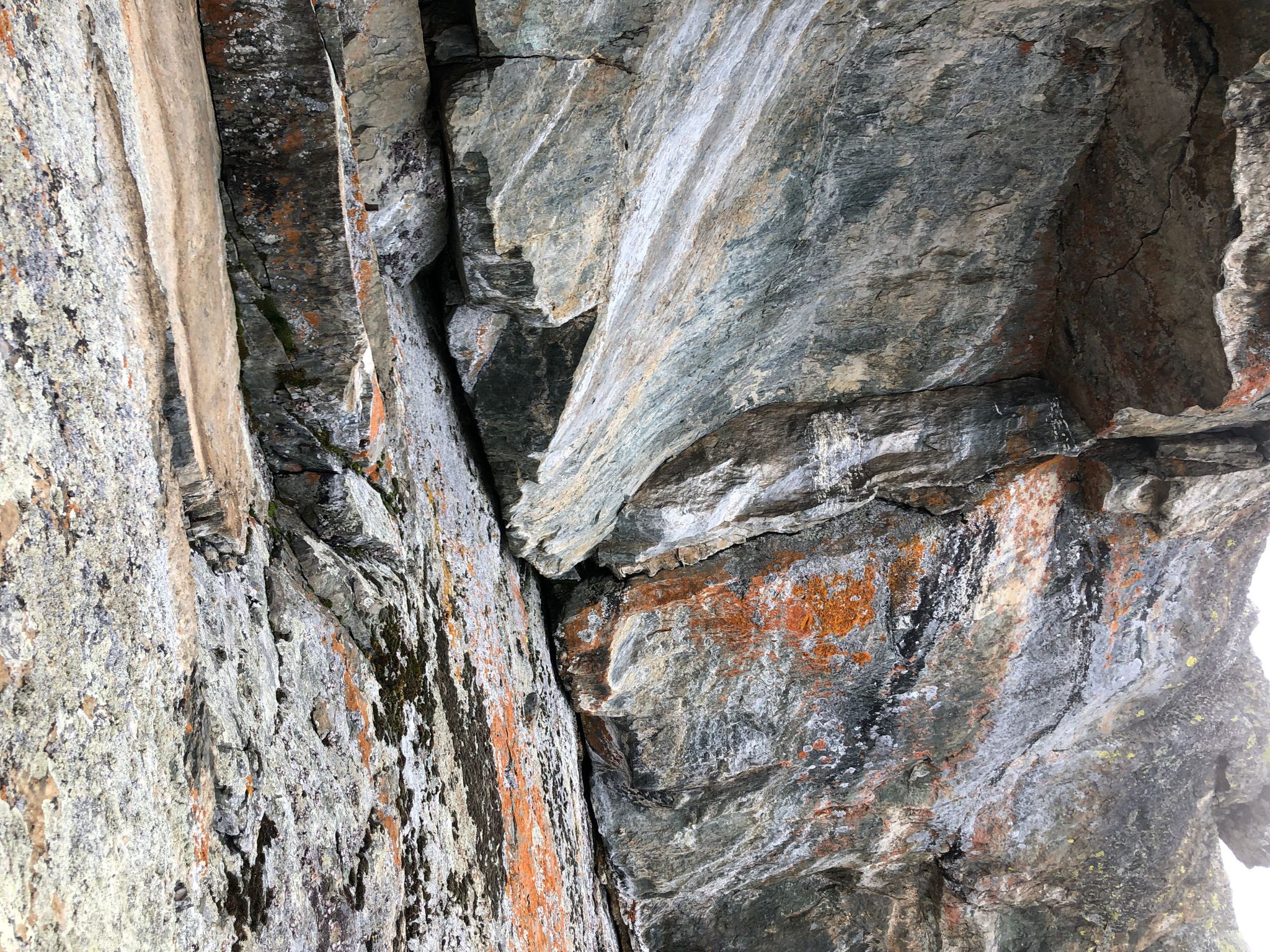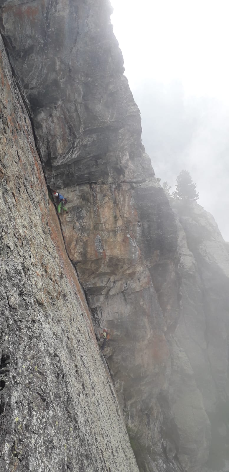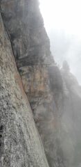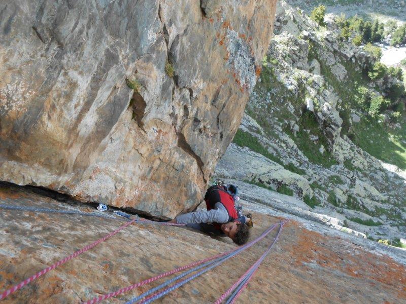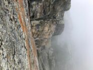 Materiale: si tratta di una scalata in fessura interamente da proteggere, in posto le soste con due spit, cordone e maillon e circa 7/8 chiodi. Portare friend da 0.2 a 5 tipo Camalot, doppi da 0.4 a 3.