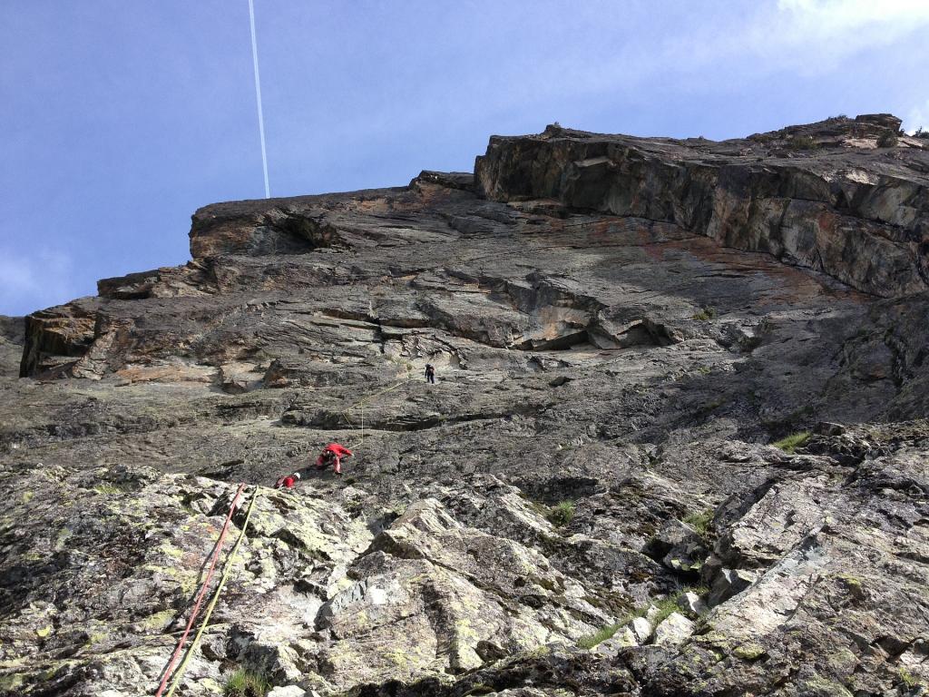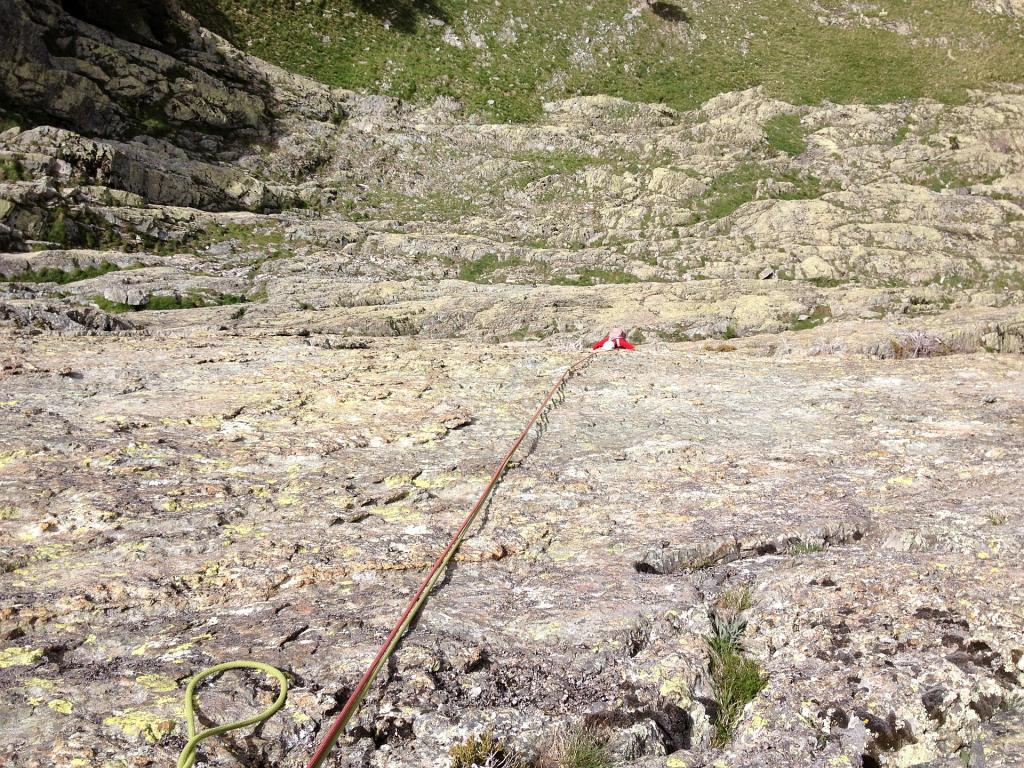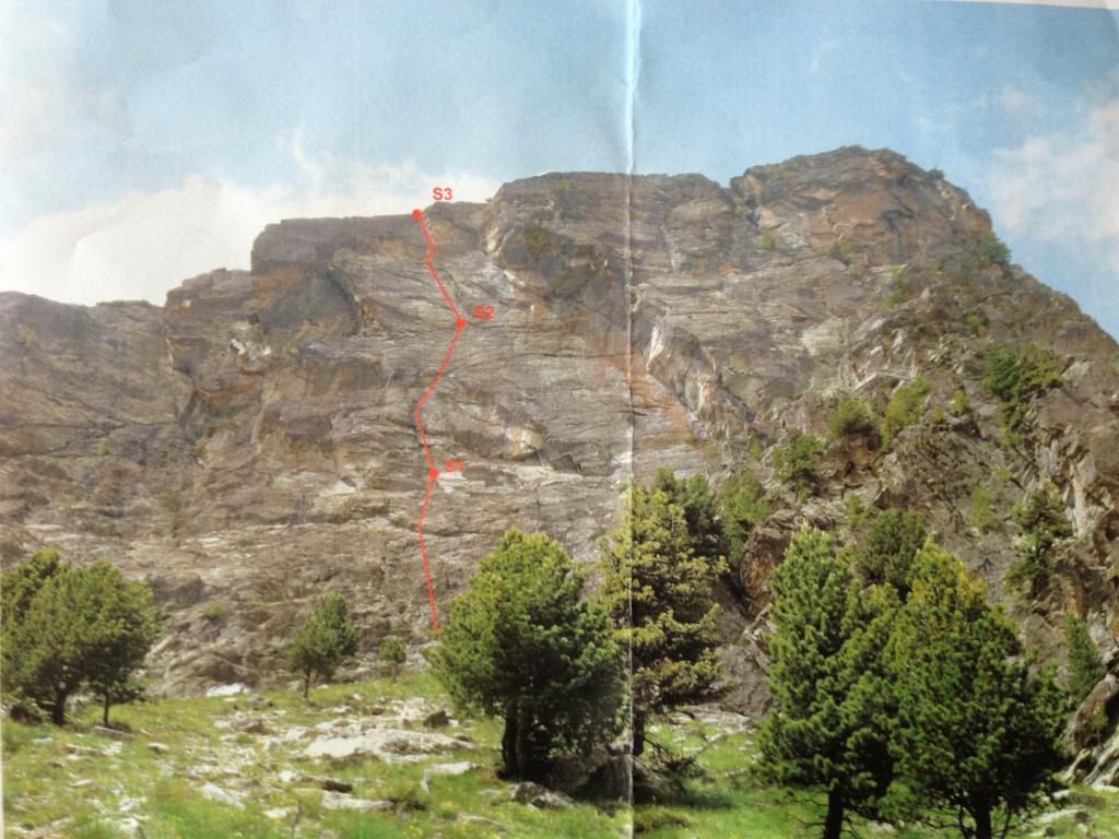 Una volta sotto, pressoché al centro potete risalire i due muretti corti (spezzati da due cenge) oppure aggirarli reperendo il primo spit, a 15 mt dal prato.