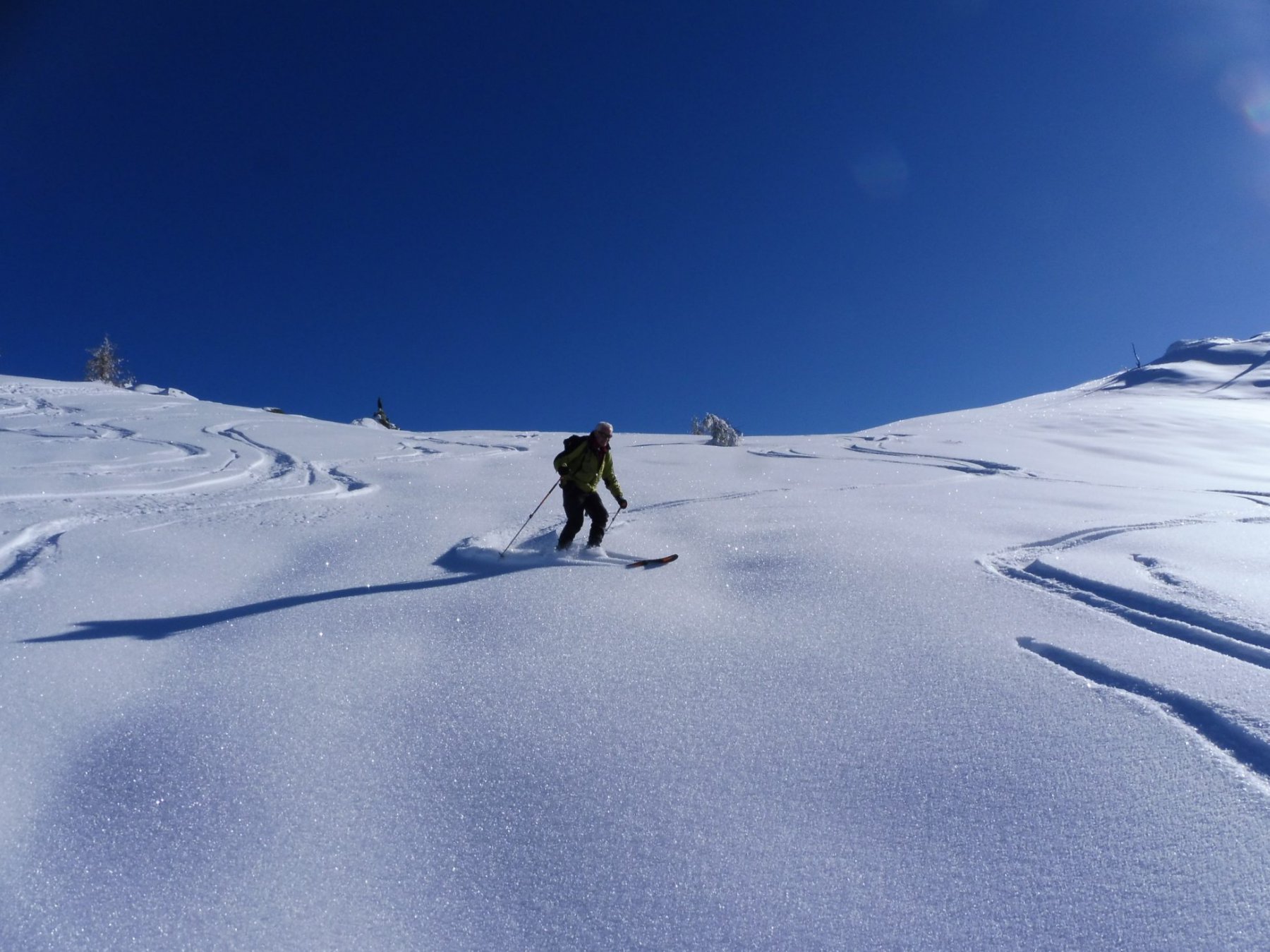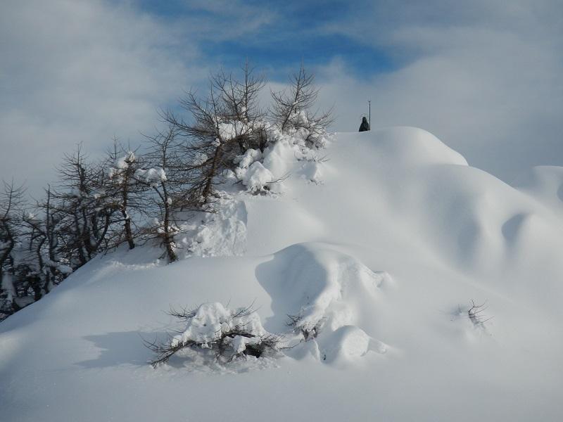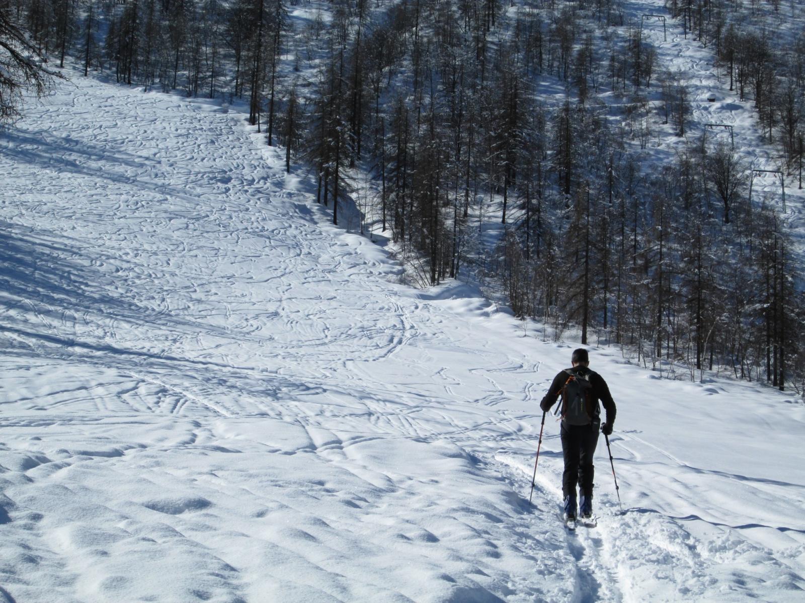 La discesa seguendo l’itinerario di salita è sconsigliato in quanto problematico nella parte bassa coperta da una fitta vegetazione boschiva.Preferire dunque la discesa lungo le piste fino a ricongiungersi con l’itinerario di salita a quota 1250m circa.