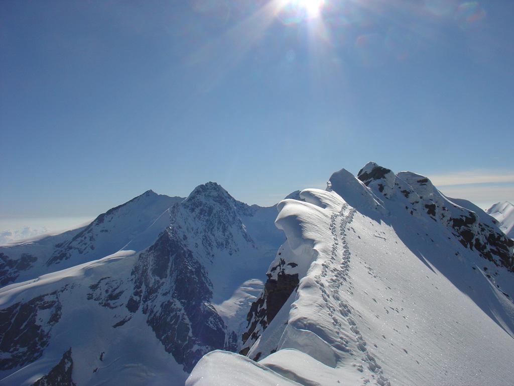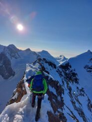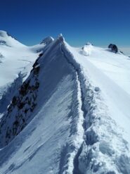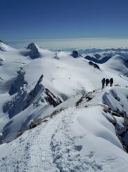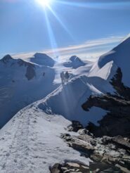 Poi si segue l’itinerario del Castore fino al colle Felik dove si taglia a est per saliscendi e crestine a volte affilate fino alla base della parete ovest del Lyskamm occidentale.