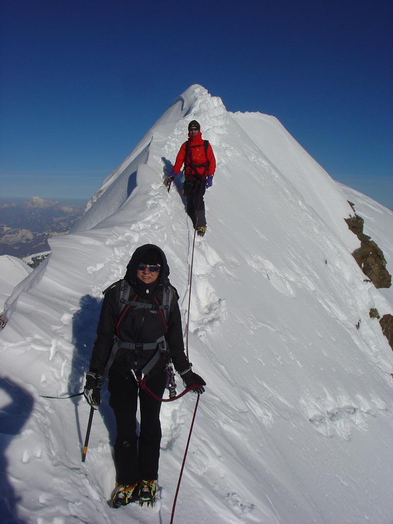 Qui le pendenze cambiano e per un lungo tratto si sale a 40/45° su una bella cresta aerea (per fortuna tutta scalinata dai passaggi dei giorni precedenti); finita la rampa in pochi minuti si è in vetta; da qui la vista è un’emozione unica: dal Cervino, passano per le vette del Rosa, al Gran Paradiso ed il Monte Bianco… ma la vista più impressionante è la cresta che conduce verso la cima orientale del Lyskamm: un susseguirsi di saltini di neve e roccia che, visti tutti insieme, sembrano quasi insuperabili.