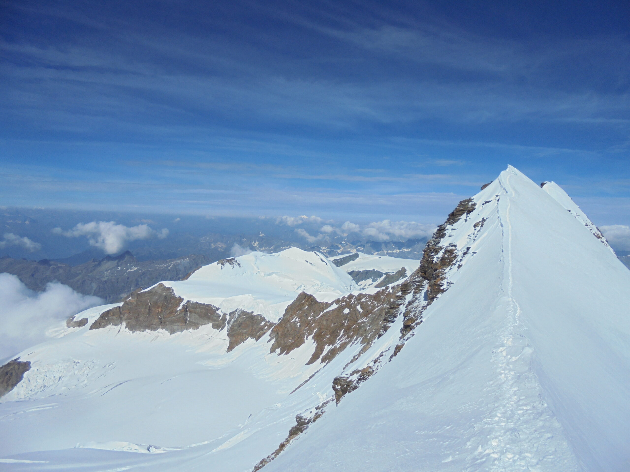 Abbiamo scelto questa direzione perché il pendio sull’occidentale non è in buone condizioni (ghiaccio di consistenza variabile): meglio salirlo stando vicino alle rocce e mettendo qualche chiodo. Scenderlo, in queste condizioni, richiede attrezzare delle soste su chiodo.