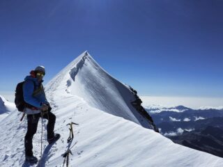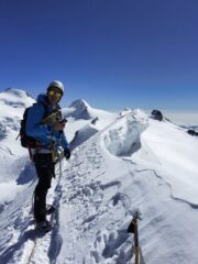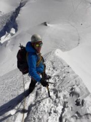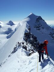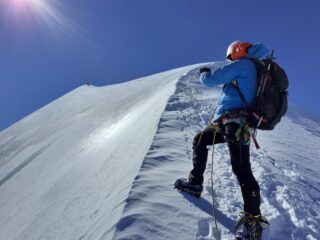 La pala del Lyskamm occidentale, per come me la ricordavo, è diventata più ripida e molto ghiacciata. Adesso la traccia sale per il suo spigolo NW e non più a sud vicino alle rocce come una volta.