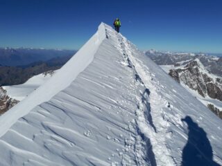 Le condizioni sono buone ma strane. Ha nevicato, risistemando tutta la cresta, ma rimangono zone in cui la neve non ha attecchito e altre in cui sotto la neve nuova si sente il ghiaccio.