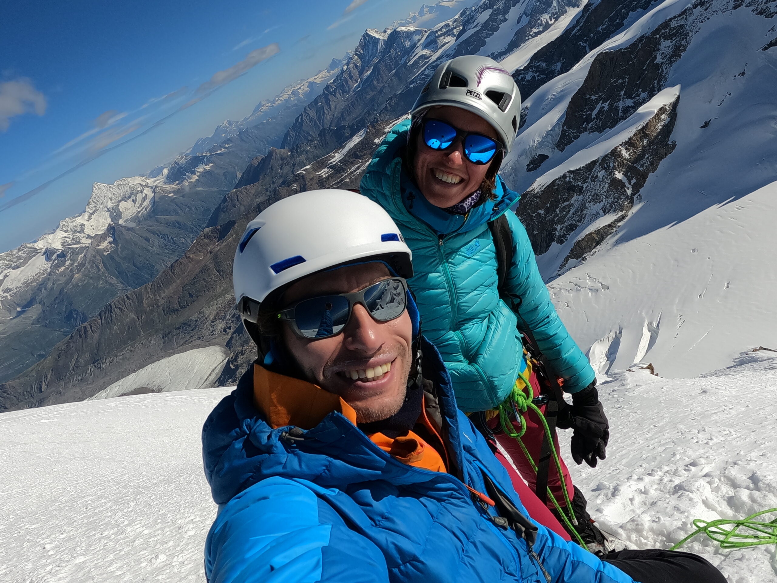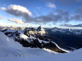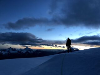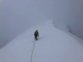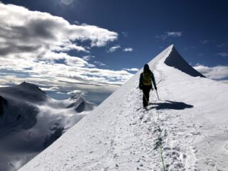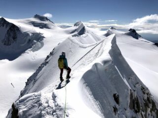 Condizioni della via perfetta, il pendio verso Lyskamm ovest è coperto di neve dura, con piccole chiazze di ghiaccio che non causano problemi. La cresta tra le cime è affilata e coperta di neve, la neve è abbastanza dura. C’era un forte vento (con crosta di neve) sulla cresta, abbastanza sgradevole ma sopportabile.