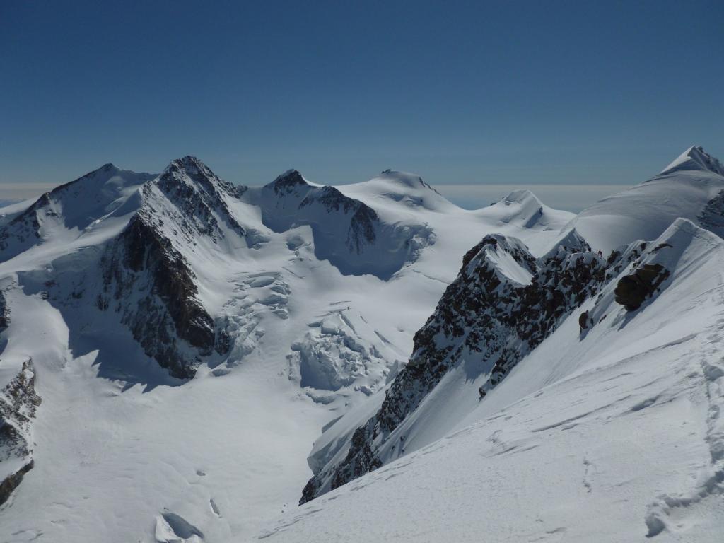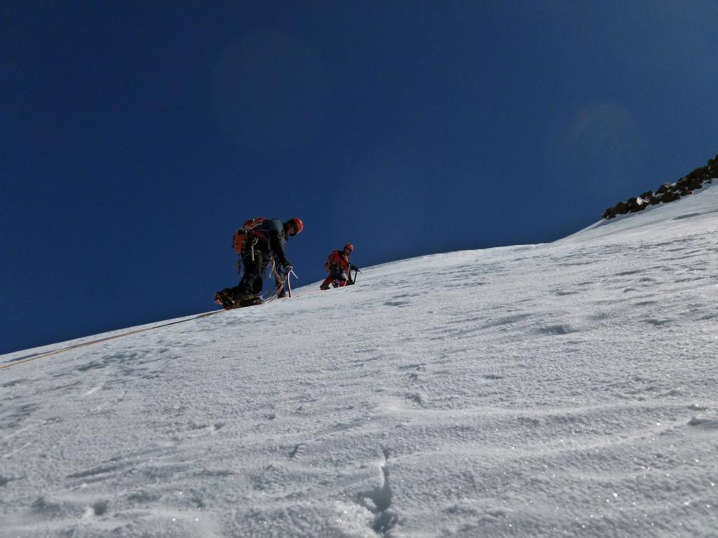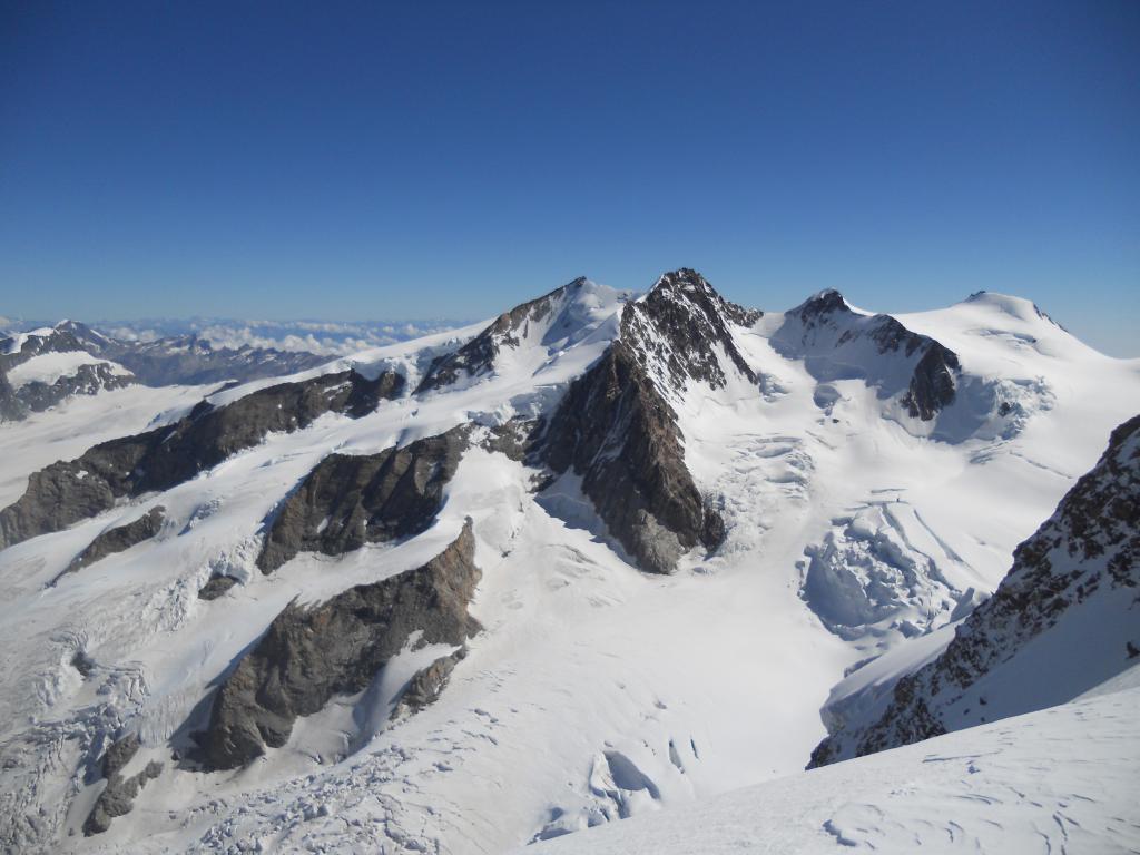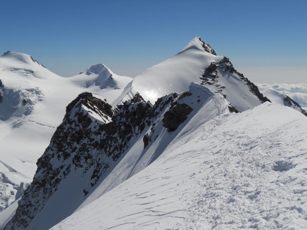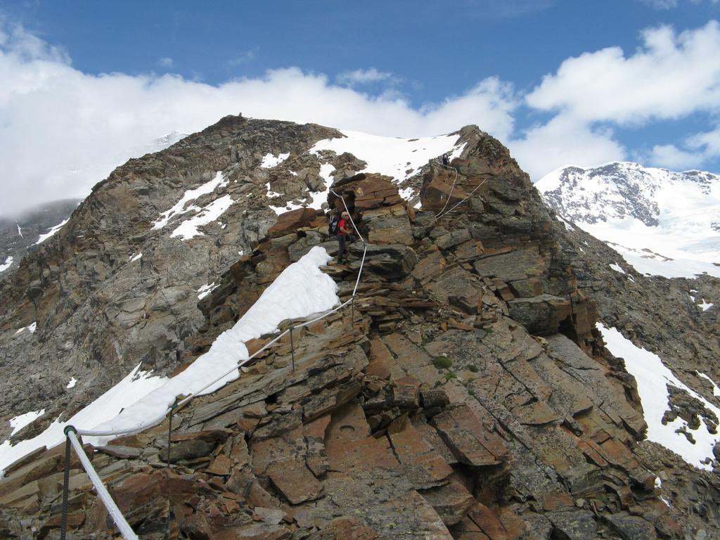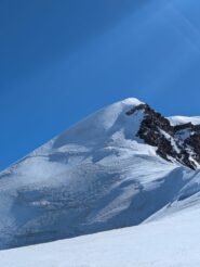 A questo punto ci si sposta a sinistra sul versante (ripido) che si segue fino alla cresta finale (m. 4449) aggirando alla sinistra un gruppo di roccette (o scavalcandole direttamente II). Da qui in 10 minuti si raggiunge la vetta (esposto).