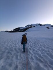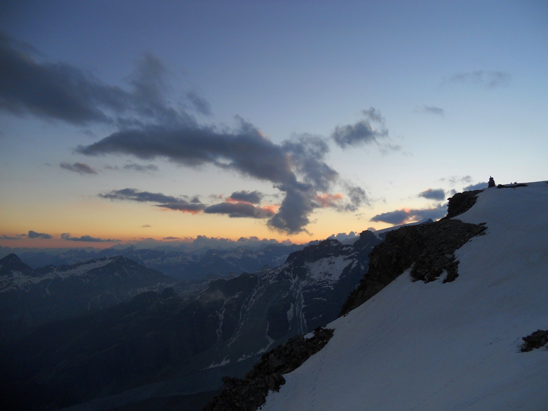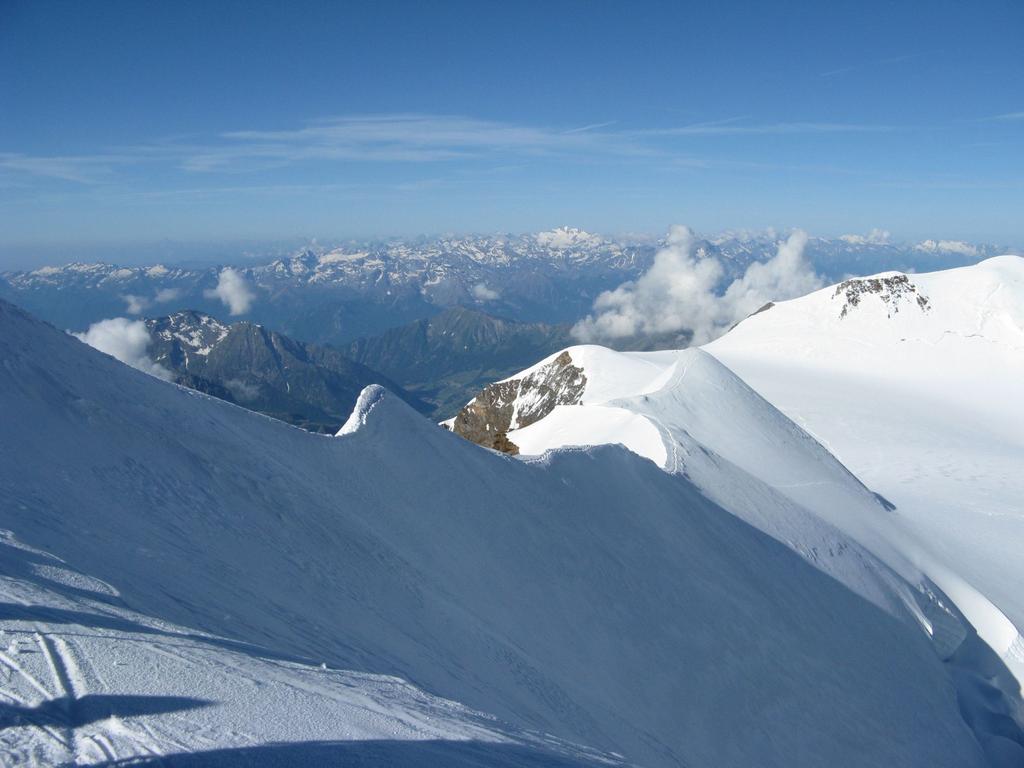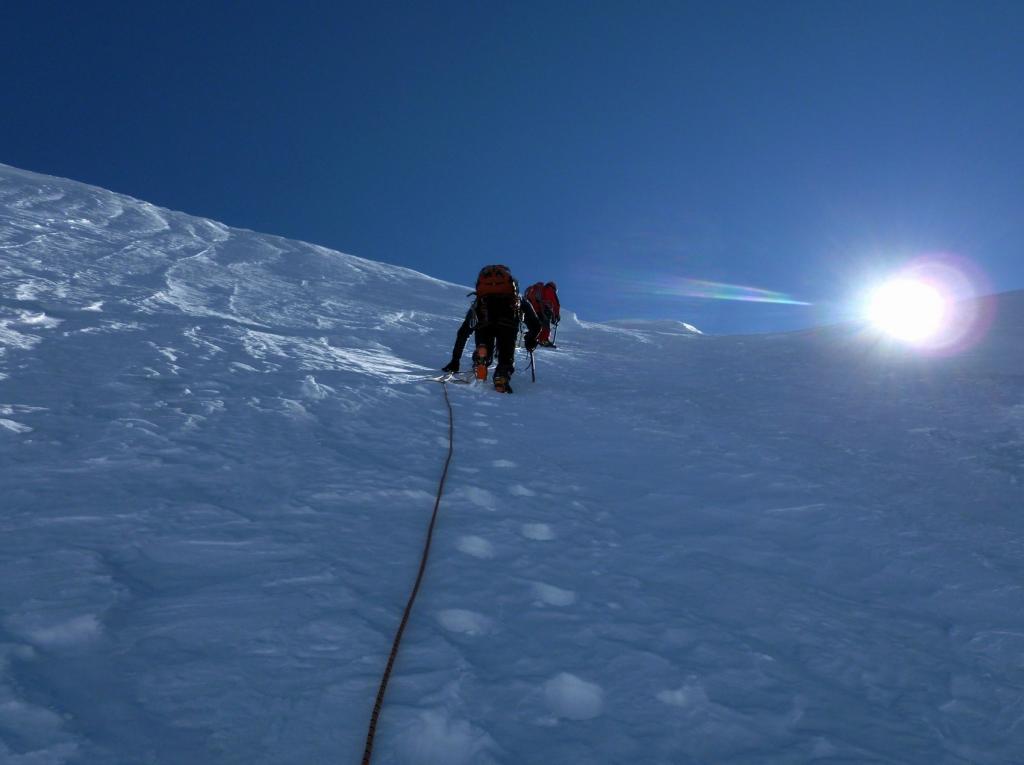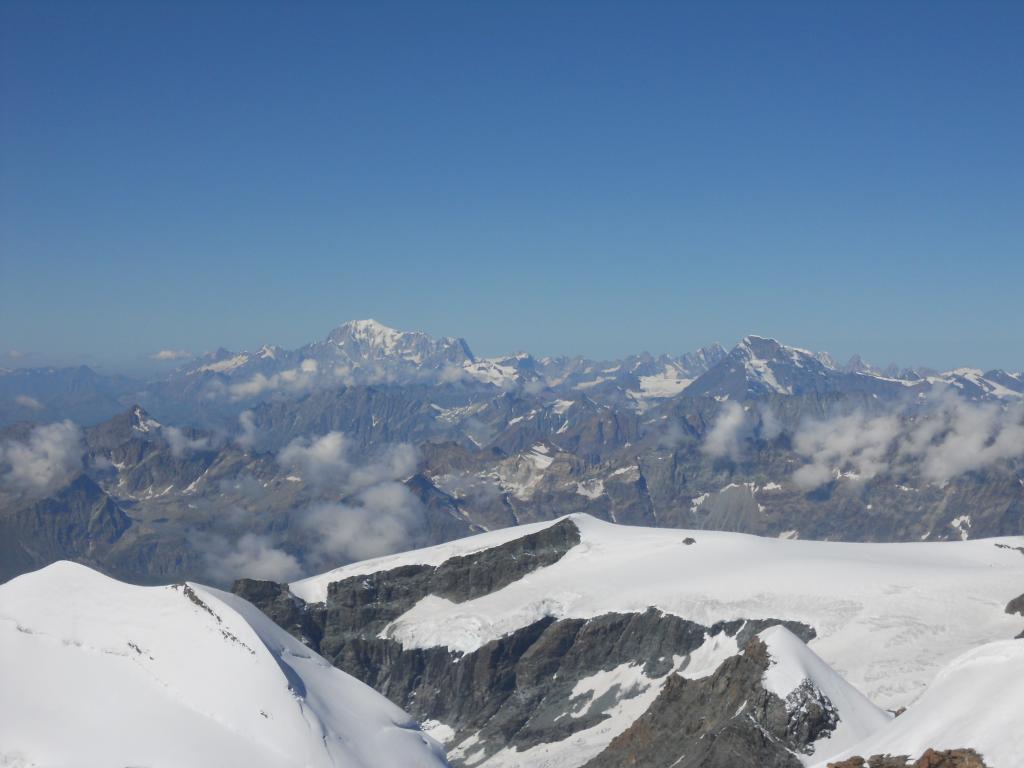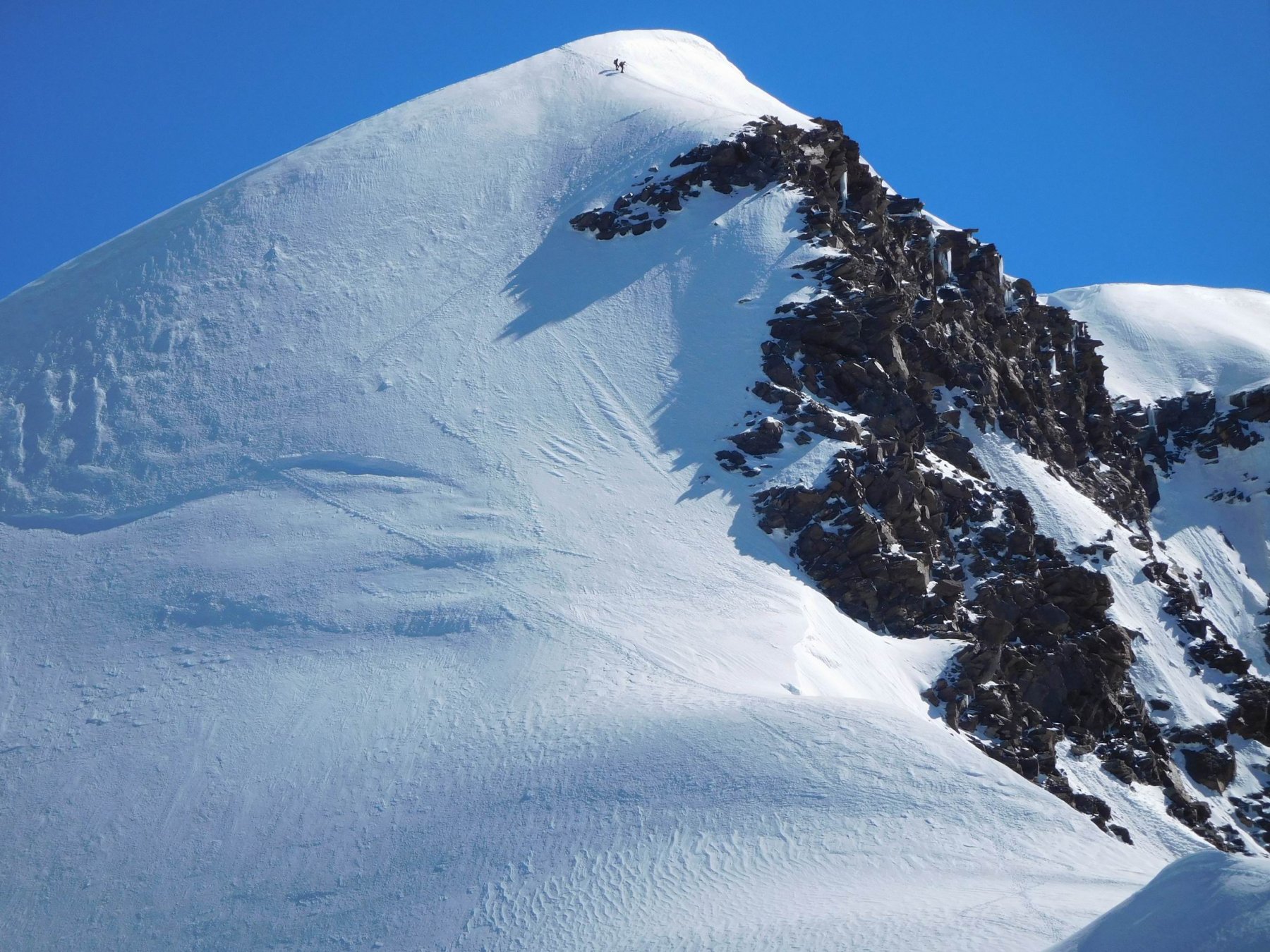 A questo punto ci si sposta a sinistra sul versante (ripido) che si segue fino alla cresta finale (m. 4449) aggirando alla sinistra un gruppo di roccette (o scavalcandole direttamente II). Da qui in 10 minuti si raggiunge la vetta (esposto).