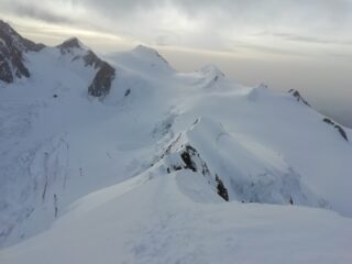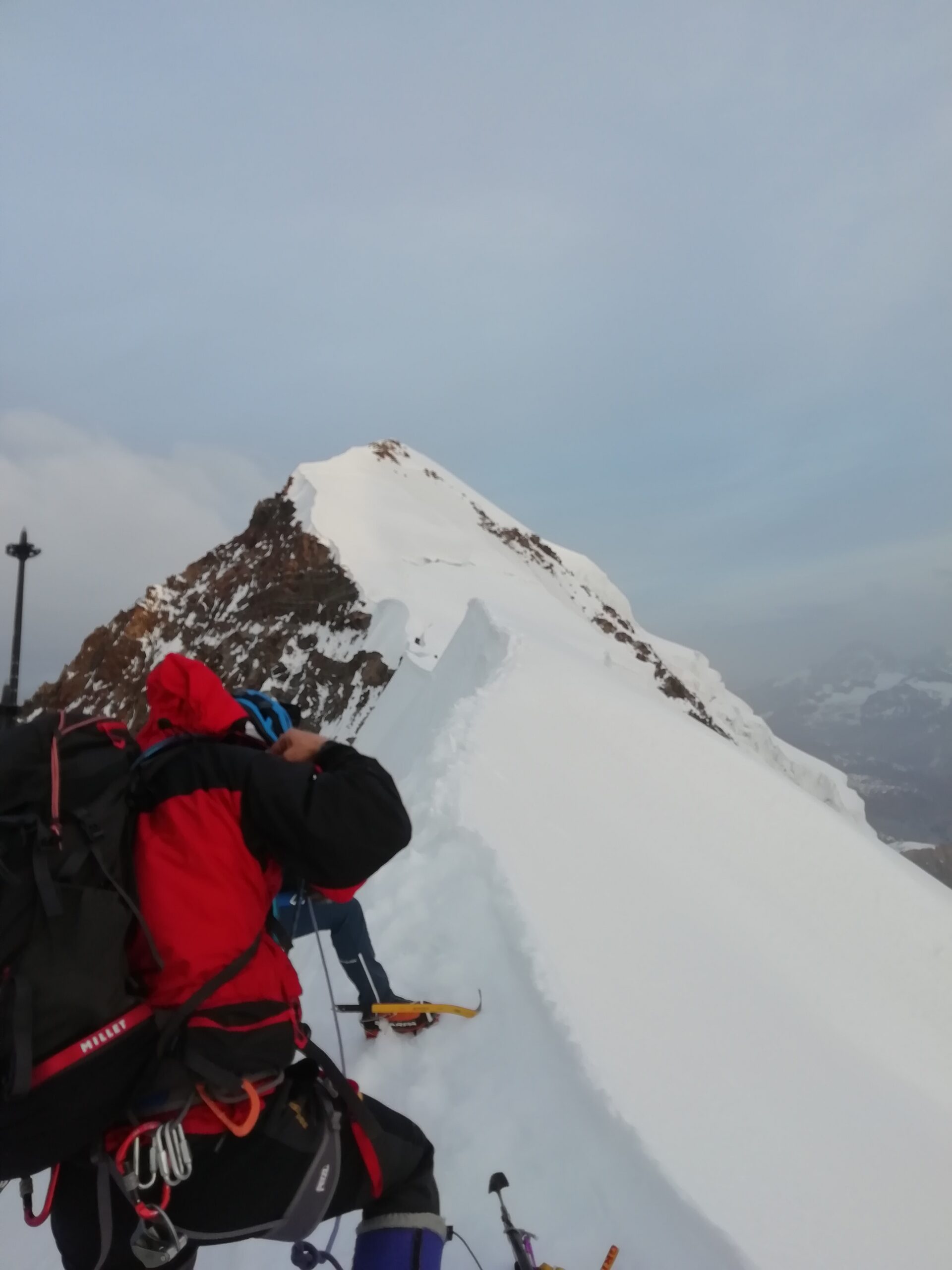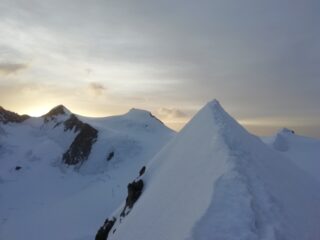 4 stelle come media tra le 5 per la bellezza e grandiosità dell’itinerario e le 3 stelle per le condizioni trovate. Abbiamo pernottato al Mantova (Ottimo!) sveglia alle 2:00 partenza alle 3:10, ghiacciaio del Lys con ottima traccia. Inizio della cresta ripido, traccia abbastanza buona ma non ottima, sempre sottile ed area con alcuni tratti ghiacciati, via veloci sul pendio dell’orientale, anche qui con qualche tratto ghiacciato. Discesa alla sella, un po’ di pausa e via verso l’occidentale, tra creste sempre abbastanza aeree e rocce di misto non banali fino all’occidentale. Pendio di discesa dell’occidentale in pessime condizioni, tutto in ghiaccio. Siamo scesi dalle roccette a sx (scendendo) cercando il percorso migliore (anche qui occhio, non banale) fino quasi alla fine del pendio facendo ancora un tiro di ghiaccio (crepacci!!). Cresta finale buona fino al piano del colle di Felik (crepacci!!). In questo tratto ci sono molti crepacci coperti, traccia appena visibile, caldo, neve molle sfondando a volte fino al ginocchio. Quintino Sella ancora chiuso, nessun in giro, poche tracce. Sulla traversata solo noi (incredibile!!!). 8:00 circa dal Mantova al Sella. Dal Quintino discesa fino a Staffal bella lunga (impianti Bettaforca ancora chiusi!), ferrata buona con qualche passaggio ancora innevato, poi veloci pendii di neve fino al bivio per il vallone di Bettolina…per prati e nevai fino al parcheggio (un po’ eterno!?)