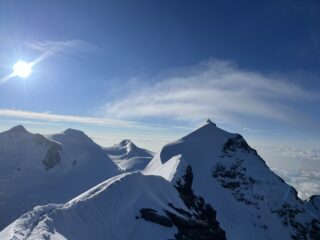 Condizioni ottime. Un po’ di ghiaccio affiorante in discesa dal Lyskamm Occidentale, abbiamo preferito fare un tiro in conserva protetta, utile qualche vite