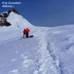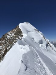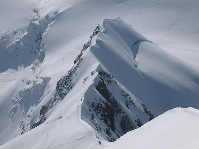 Si traversa verso ovest e si raggiunge la base dell’evidente cresta, la si percorre inizialmente sul filo, pochi metri dopo superare crepaccia terminale.