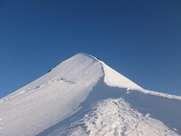 Un pochino di vento ma accettabile, temperature più fredde rispetto al sabato. Nessun problema nell’incontro con le cordate in senso opposto anche se in alcuni tratti nella traccia c’è posto per un piede solo.