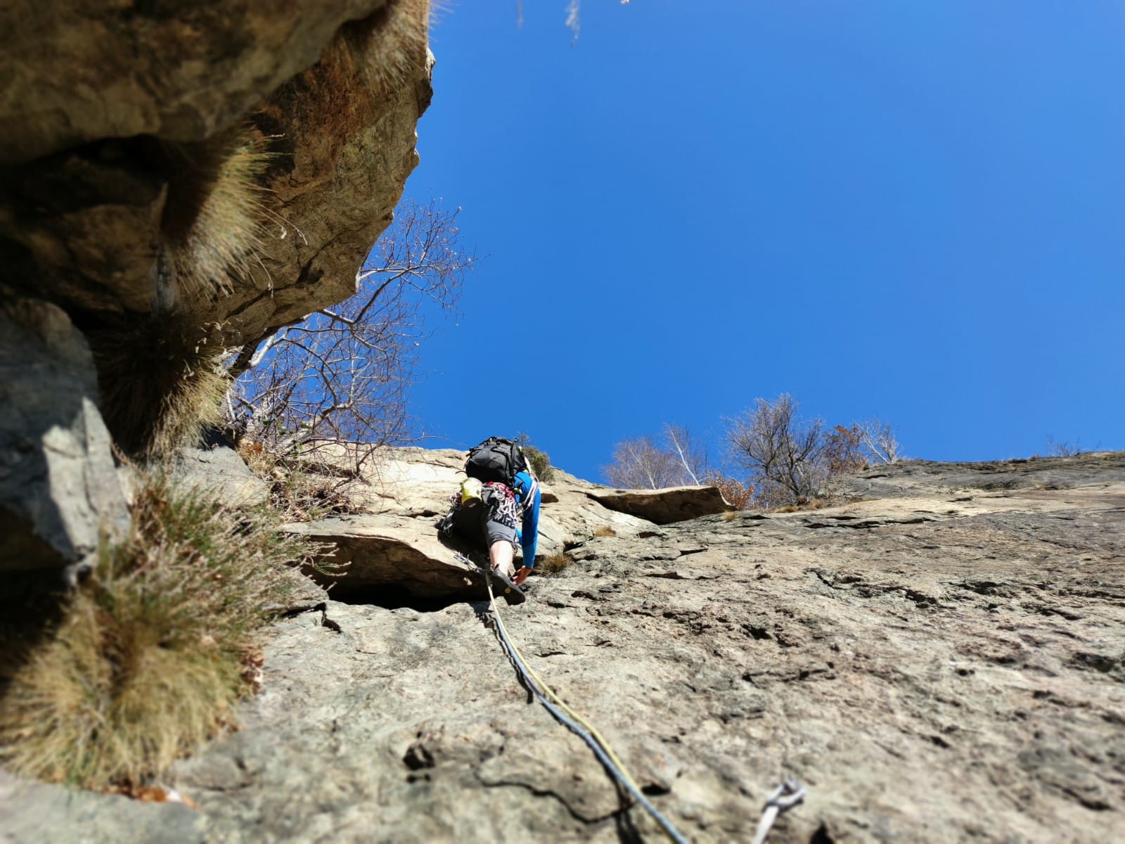 - L1 bellissimo tiro che segue la fessura sino sotto ad un tetto, aggirarlo a destra e proseguire verso sinistra fino alla sosta – 35 m 5c/6a (sosta in comune con “me te spleucco”)
