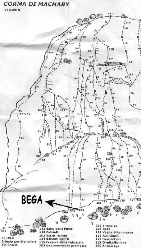 BEGA sono le iniziali degli apritori: Bergliavaz e Garbi, che inaugurarono i primi tre tiri della via dal basso e con foratura a mano. Dopo di che acquistarono un trapano... La via attualmente richiodata, molto rispettosa dell'attrezzatura originaria, tuttavia la fa terminare per placche e smorza l'impegno della via primitiva, che entrava direttamente (con un tiro di 5c ora eliminato) nel diedrone del Galion, finendo davvero in bellezza.
