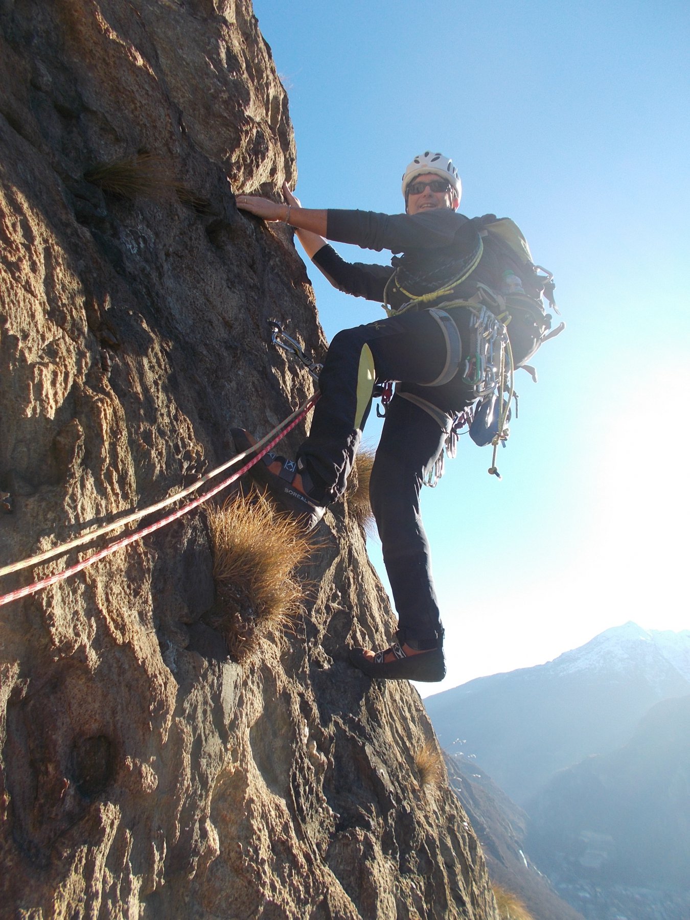 Attenzione al quinto tiro, roccia molto rotta e che richiede cura nel tiraggio.