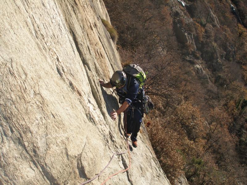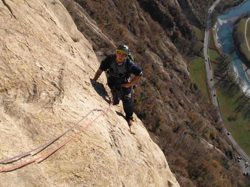 Oggi si stava molto bene, c’era poco vento e un sole caldo. La via è molto bella, e neanche tanto impegnativa tranne per la spittatura un po’ lunga ma si sale bene, ho messo un friend una volta e forse anche in una delle poche fessure. dalla sosta del quarto tiro bisogna stare a destra, perchè gli spit subito sopra la sosta sono di Anchorage(6b), io l’ho capito quando ero a metà tiro. Con Marco che si e fatto l’ultimo tiro da primo