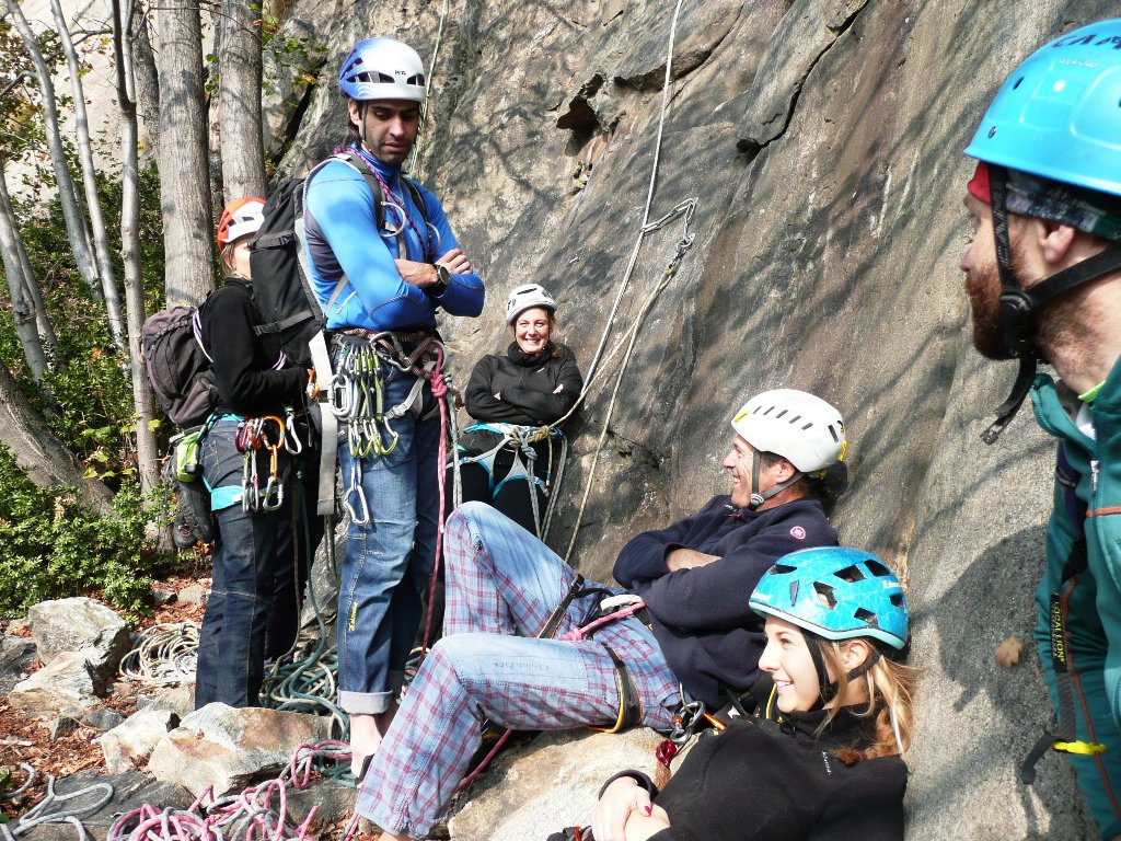 Affollamento pazzesco, tanto che alcune cordate tornavano indietro subito dopo l’avvicinamento per evitare lunghe code alla base, altre invece si calavano, chi dopo 3, chi dopo 4 o 5 lunghezze per evitare la ressa nei pressi dei tiri chiave, dove si trova forse l’unica sosta un po’ stretta che fa da collo di bottiglia. Non era la giornata adatta per una scalata in pieno relax per una macchinosa cordata da 3 ma alla fine riusciamo ad arrivare in cima. Durante l’ attesa sulla cengia alberata riusciamo anche a sgraffignare un paio di tiri su Bega(L5) e Anchorage(L4), e meno male che non siamo stati con le mani in mano: i tiri che si fanno in genere dopo una via lunga per riempire la giornata sarebbero passati in cavalleria dato che siamo scesi dal sentiero attrezzato ormai al crepuscolo e per poco non c’era da usare la frontale. Al sesto tiro ci siamo tenuti troppo a destra e siamo finiti (credo) sulla via Nulla al Caso che abbiamo percorso nelle sue ultime 3 lunghezze, la prima delle quali con difficoltà più sostenuta del banano. Per il resto condivido le considerazioni fatte da Pinin ed altri. Con Giulio86 che si è tirato quasi tutta la via ed i tiri adiacenti, Andrea (ghemon), a me i 2 tiri d’uscita in velocità per scaldarmi un po’. Vento freddo e fastidioso nella parte alta, meteo meno bello delle attese, nei pressi di Montestrutto piovigginava, qui roccia asciutta e perfetta.