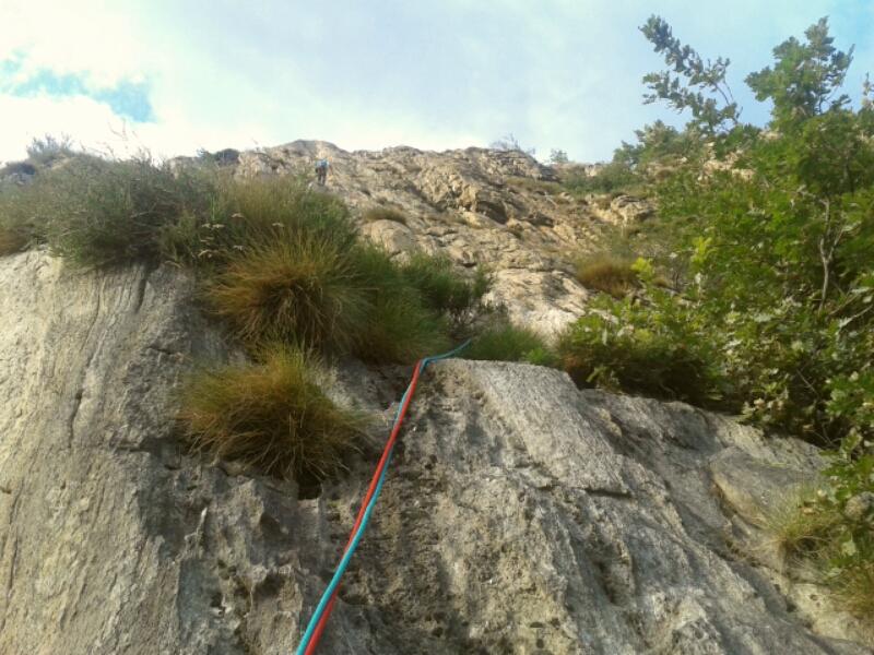 Abbiamo iniziato la via alle h 18, 00. La via è carina. Per movimentare un po’ i tiri facili, siamo saliti in conserva “protetta” con le corde da 60 mt completamente distese saltando un po’ di spit. Oggi molto caldo. Arrivando in cima, siamo scesi su un sentierino molto ripido, scivoloso ed esposto (un paio di corde aiutano nei punti più pericolosi). Il sentiero parte appena più in basso ed a ovest dell’ultima sosta. L’inizio del sentiero è segnalato da un omino di pietra. Vari bolli gialli aiutano ad individuare il sentiero anche quando le foglie autunnali lo ricoprono. In brevissimo tempo si ritorna alla base della parete a ovest delle vie. Con Giorgio.