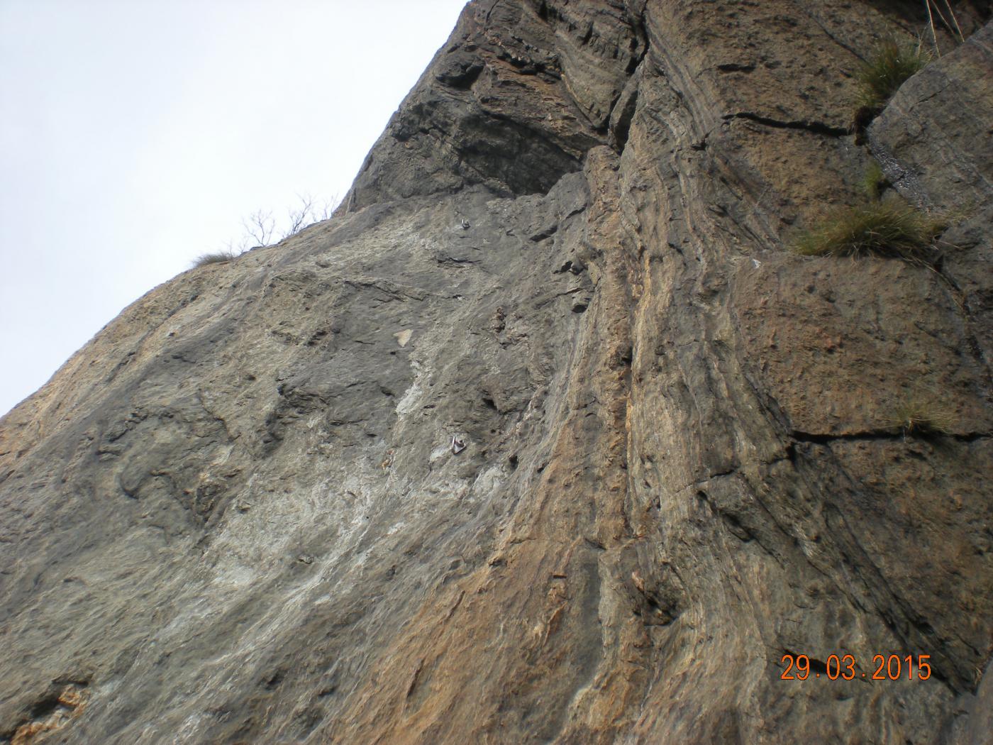 A noi la via è piaciuta. Oggettivamente è lunga (sono 13 tiri ed un breve trasferimento, considerando tiri tutti i tratti protetti da spit) e quindi abbiamo apprezzato anche le discontinuità, utili per riposare un po’ nella seconda parte. Oltre tutto alcuni tiri di 3c non sono così banali, per la roccia saponosa e qualche sgrondo d’acqua. Sul ripiano all’uscita del terzo e prima del quarto tiro (quello dello strapiombino) è facile sbagliare via (io naturalmente ci sono riuscito;). L’attacco giusto (quello con il nano di guardia alla base) si trova sulla destra del ripiano (a 7-8 metri). Sulla sinistra, più visibile, c’è invece una sosta con catena su albero (Diretta allo Dzerby?). Niente di male, ci si ritrova comunque alla sosta del quinto tiro, ma invece dell’amichevole traverso coi buchi segue appunto la linea diretta, più liscia e verticale, direi un mezzo grado in più (così le ho fatte entrambe e la prossima volta sceglierò la più simpatica;). Sentiero di rientro eterno (ma lo sapevamo già) e vento fastidioso ma non freddo.