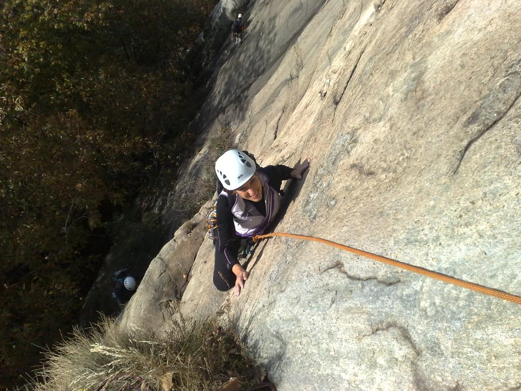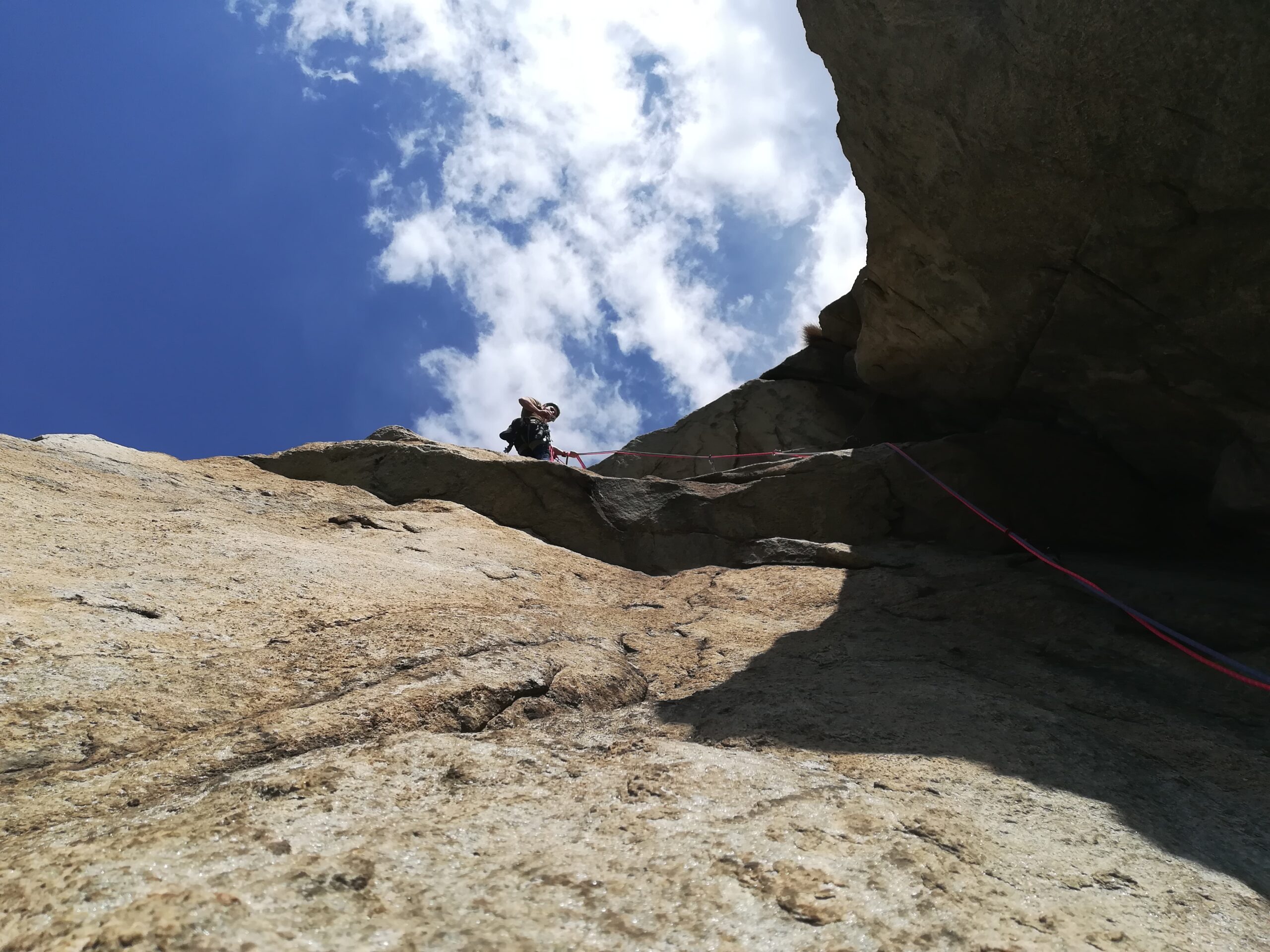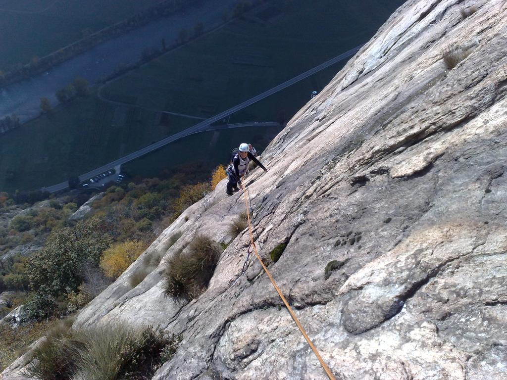 - Da qui salire un po’ a dx fino alla base della parte superiore del paretone, che si può superare con 4 tiri su difficoltà minori con varie possibilità.