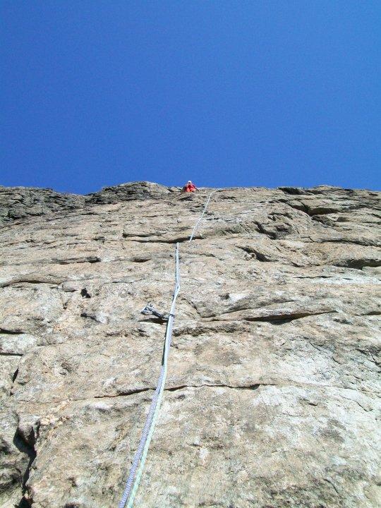 La via si snoda tra cenge e conchette con diversi passi in traverso. Concordo con barby75: impegnativi il secondo tiro, l’inizio del terzo e qualche passo sul quarto sotto il muretto e quinto tiro. Volendo è possibile integrare con qualche friend medio lungo la seconda metà della via.