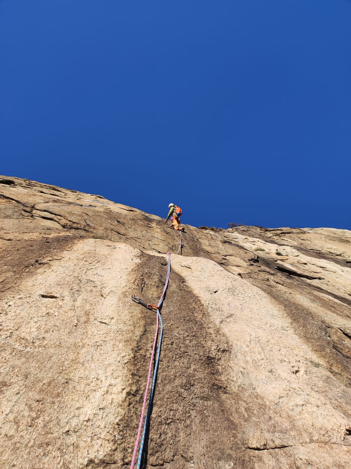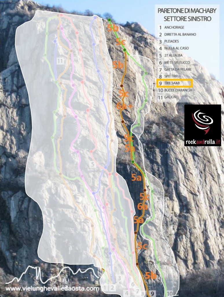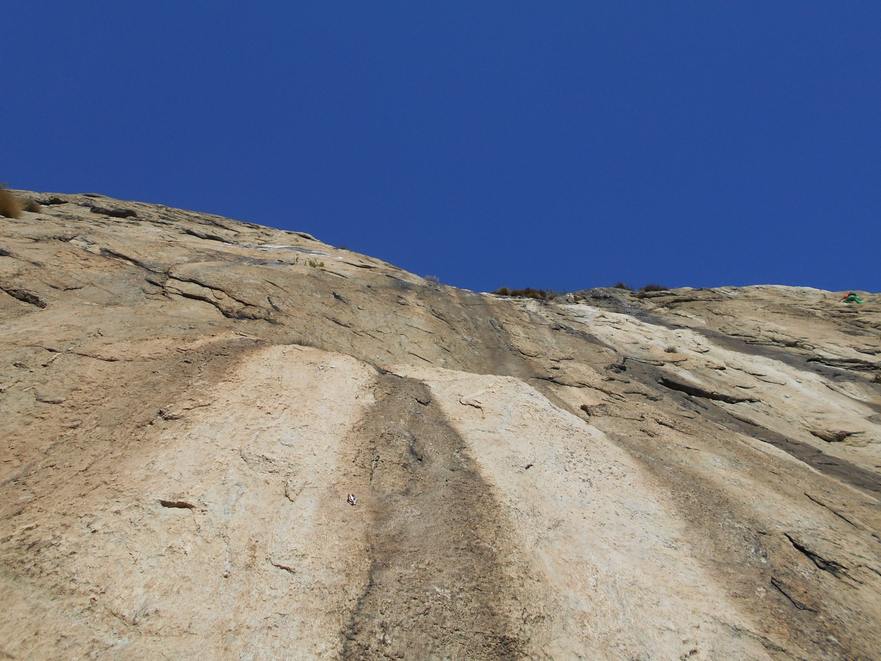Dopo il secondo tiro continuare diritto perche' la fila a sinistra degli spit potrebbe trarre in inganno, il terzo tiro parte abbastanza facile e ha l'uscita a destra su un tetto e continua in placca , dopo il 4° tiro ha la sosta in comune con buccia d'arancia per poi dividersi e continuare a sinistra.