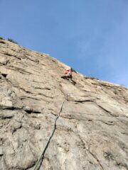 L’aspettativa era tanta, ma la relatà dei fatti ci ha lasciati parecchio titubanti. Su 10(???) Tiri, 4 o 5 solo sono stati spettacolari, gli altri non ci siamo : relazioni qua e là sbagliate, molti tiri levigati e scivolosi e due lunghezze di trasferimento tra rovi e terra. La spittatura era veramente fuori portata, ci può stare, ma forse così è esagerata. Se si dovesse scivolare, alcune cenge sottostanti potrebbero essere davvero pericolose.