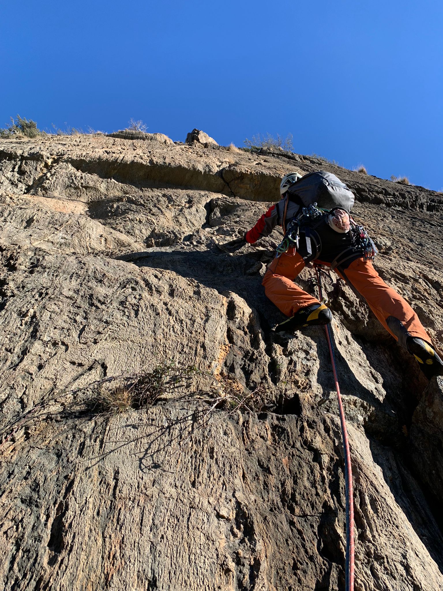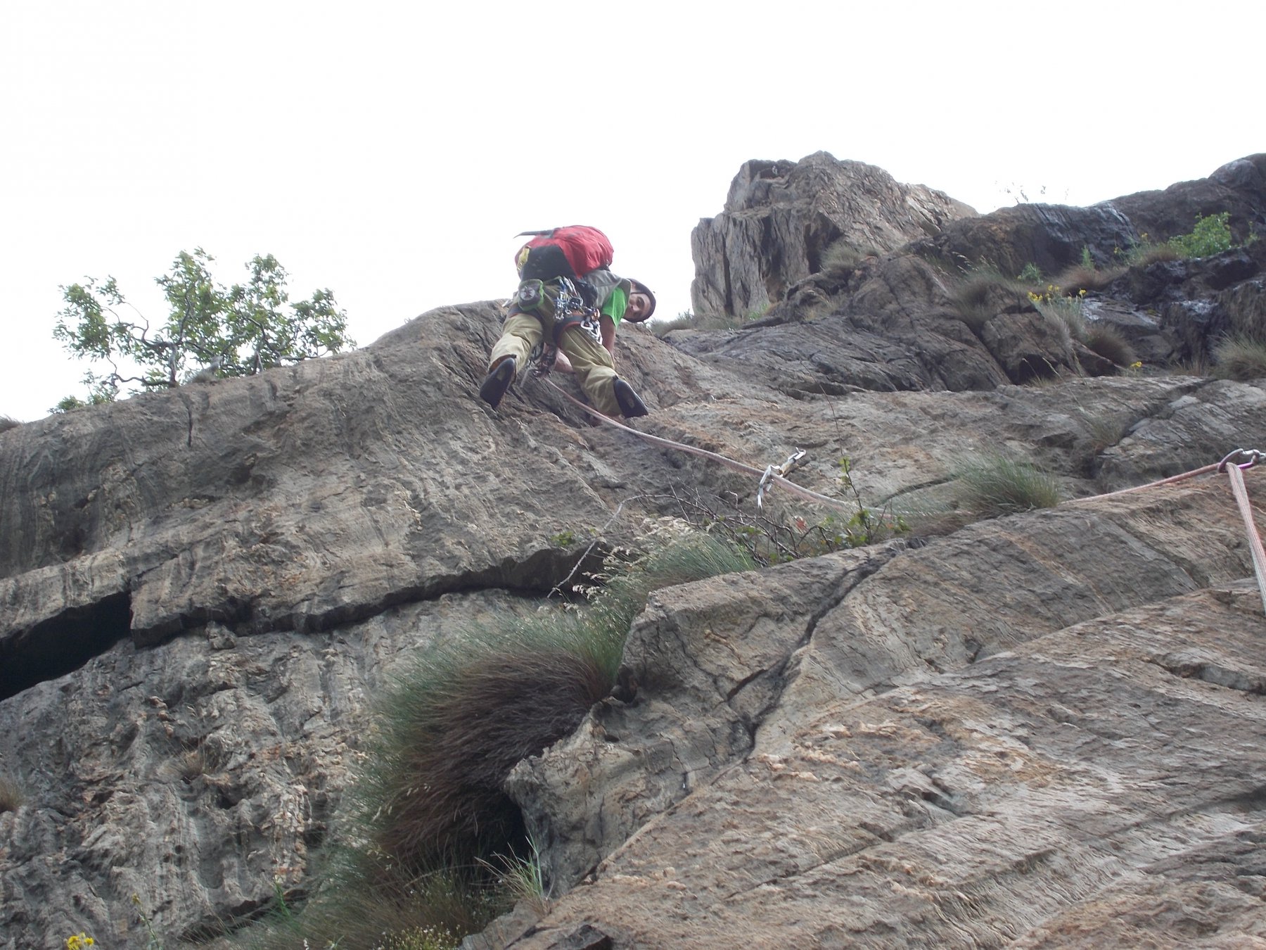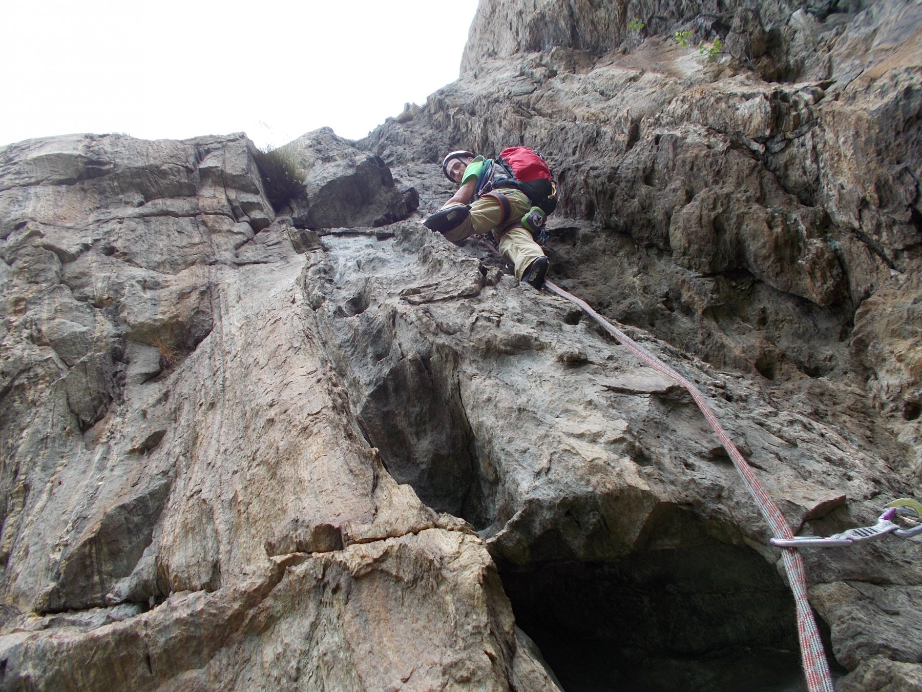 - L1: facile traverso a dx ben protetto in considerazione che può colare molto e c’è un po di verdura, poi si ritorna a sinistra per sostare su comoda cengia. 3a,4a