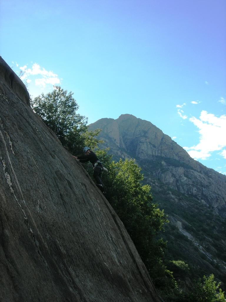 Via di placca, discretamente continua, protetta abbastanza bene, che non presenta mai un attampicata molto esposta.