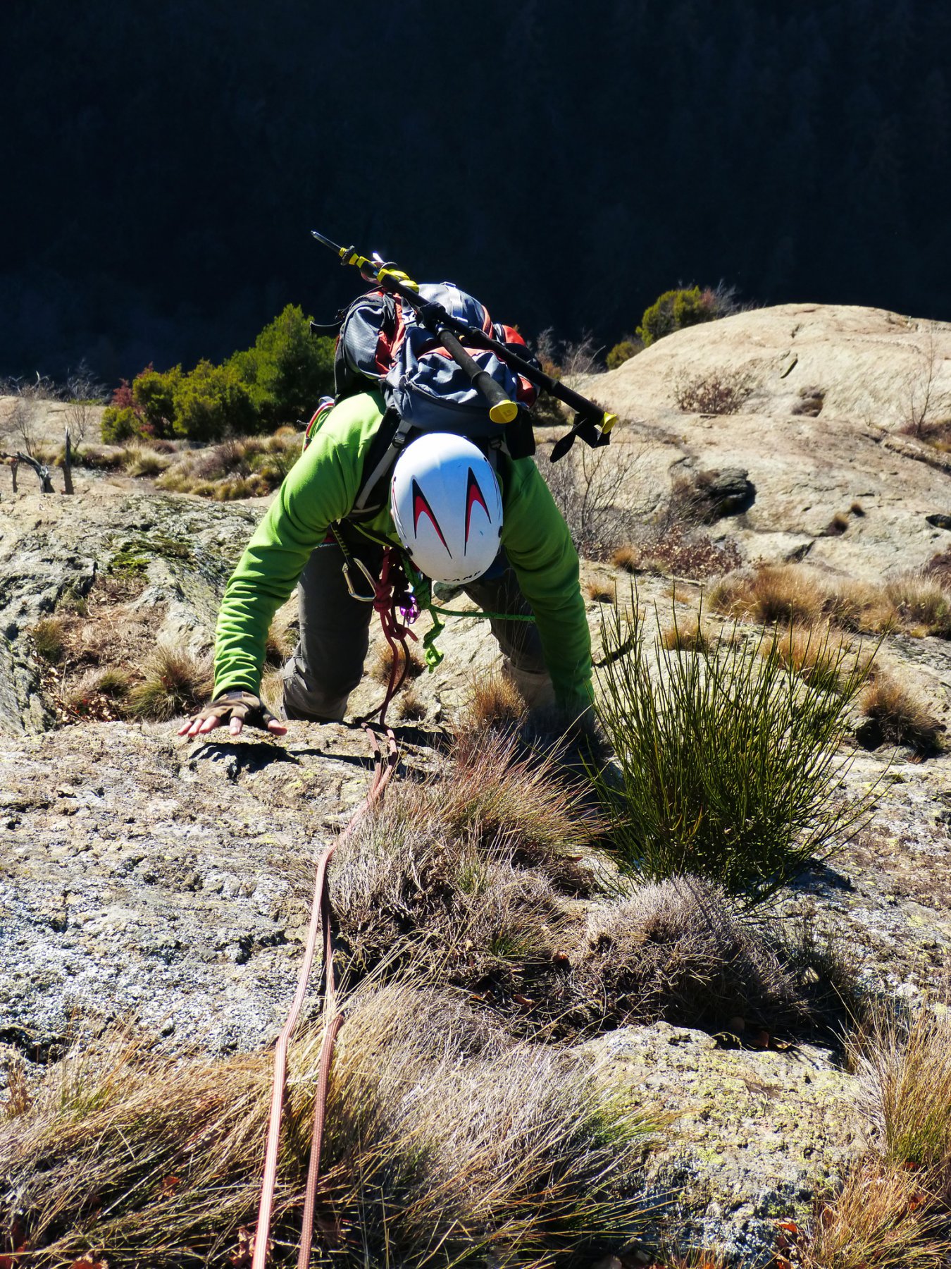 Tutte le soste sono da allestire, spit perfetti (se ci fosse stata la catena o anello di calata sarebbe stata comoda la doppia, giusto per evitare la discesa nel bosco), magari la prossima volta seguiamo la via che precede (La Pinna).