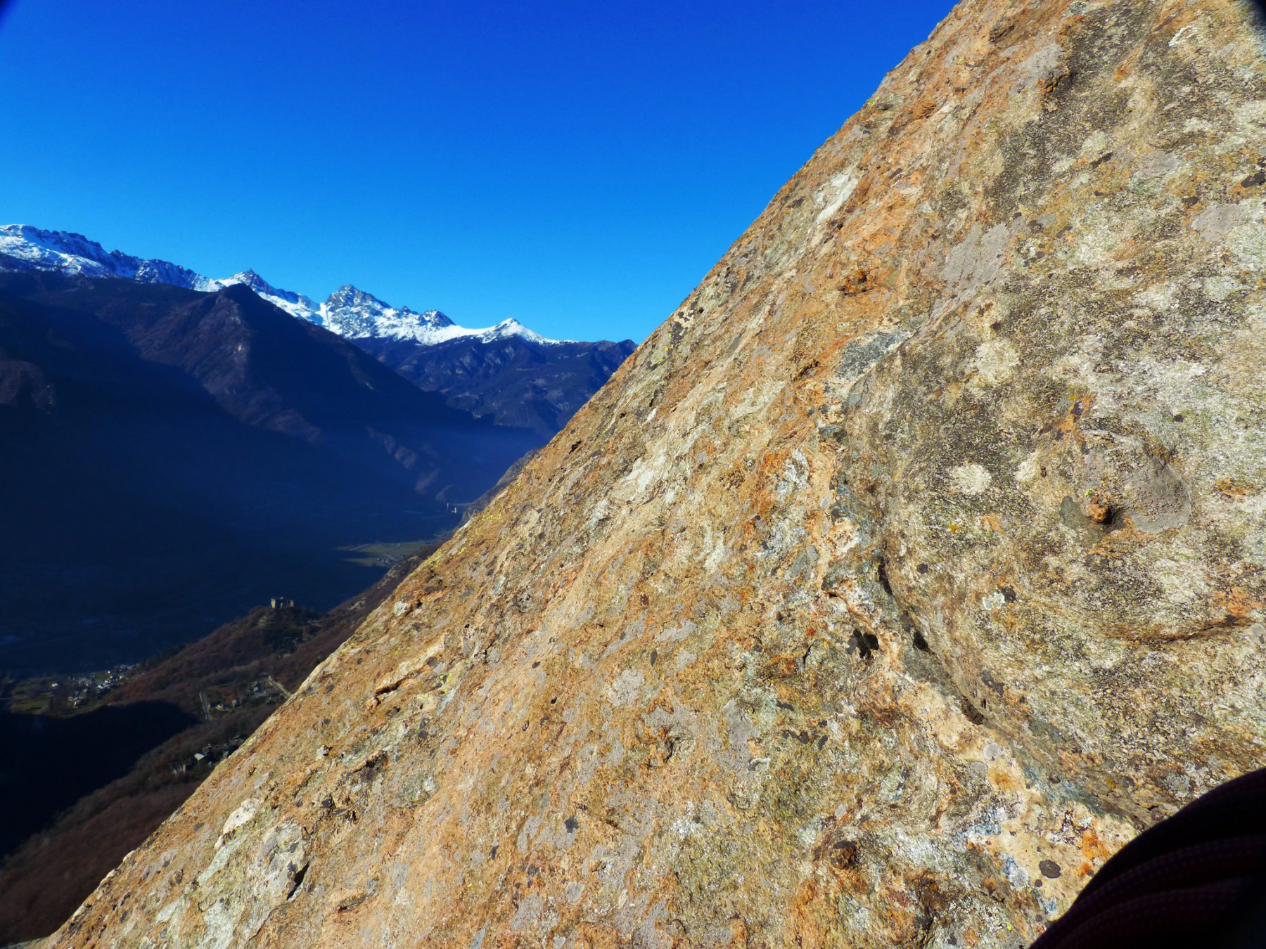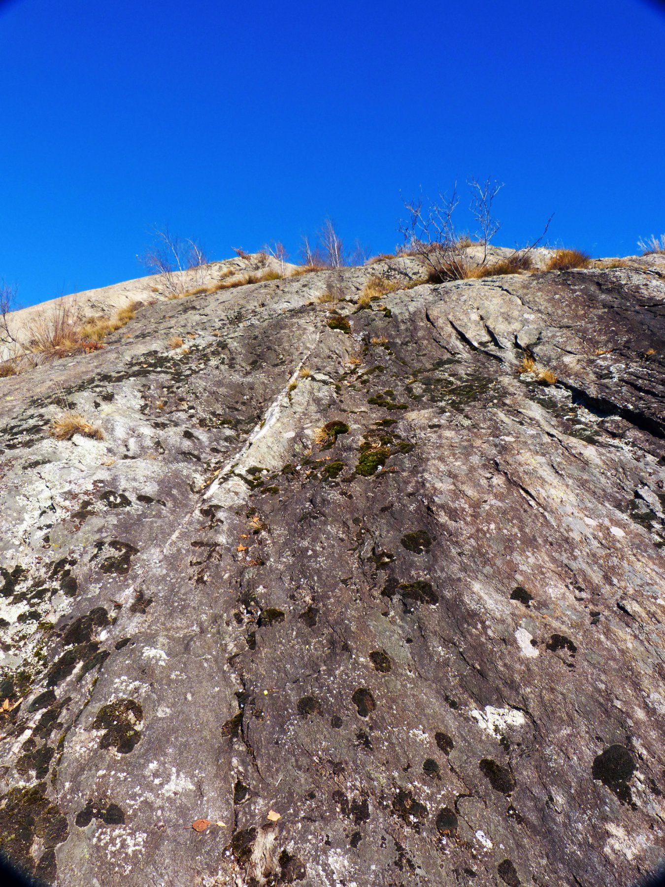 Trovato il parcheggio senza troppi problemi…torrente da guadare è stato individuato senza problemi ma da lì è iniziato un vagare per trovare i primi segni in un bosco coperto totalmente di foglie, ricci di castagne e rovi fino all’apparire di qualche ometto che poi stando all’occhio era piuttosto frequente sebbene in ripida salita, purtroppo ci siamo persi e non abbiamo trovato il famoso masso con le indicazioni delle vie (il cui attacco doveva essere circa a 800m) ma per fortuna avevo l’altimetro…che indicava (975m) …la via finiva a 1.045m; siamo scesi seguendo la placca fino a scorgere un paio di spit dai quali siamo partiti, alla fine abbiamo fatto solo 3 tiri su placca estremamente semplice e rugosa, “Senza Mani” per davvero”; il panorama in cima è comunque gradevole in una bella e tiepida giornata.
