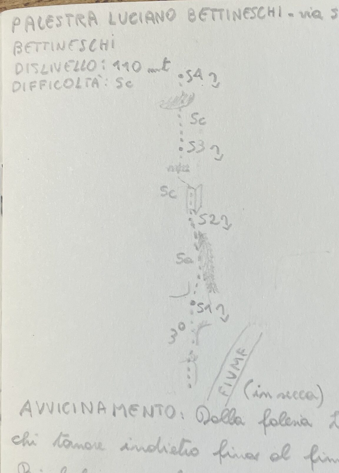 Attrezzatura: 8 rinvii, cordini per soste. È possibile usare una intera da 60 metri (consigliata la 70 per arrivare fino al fiume con l’ultima calata) oppure mezze corde. Soste con maillon da collegare.