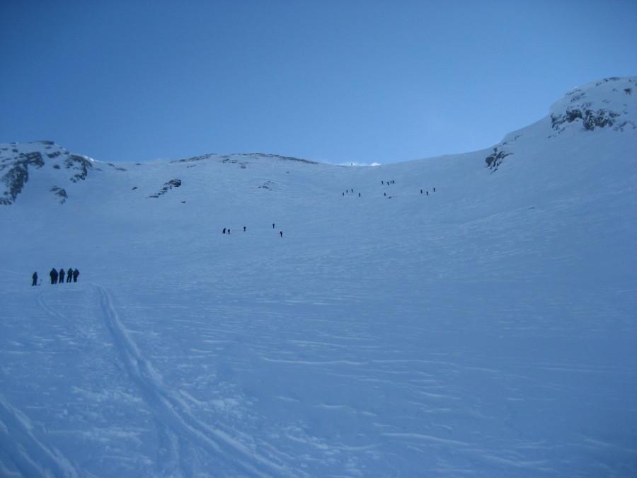Gita condivisa con il gulliveriano (d.o.c.) “abe” (“ricopio” il suo autorevole commento) e con altri otto giovani (e soprattutto forti) sci-alpinisti milanesi/lombardi e quindi grande compania. Condizioni discrete dell’itinerario, e forse anche per questo, oggi è stato scelto da numerosi sci-alpinisti. Ritengo giusta la valutazione -2- del rischio valanghe prevista dai bolletini svizzeri e penso possa valere ancora per qualche giorno -a parità di condizioni meteo-, la parte alta, più ripida è pressochè completamente in ombra anche al pomeriggio. Condizioni discrete, ma gita sicuramente …”spaziale”…, non solo perchè oggi il cielo lo era veramente, ma per me in particolare molto significativa per la possibilità di essere ritornato “sui monti”… In vetta, oggi è suonato -e si è elevato “in cielo”- il canto “Laudate omnes gentes”…