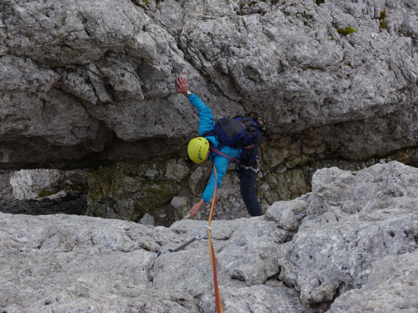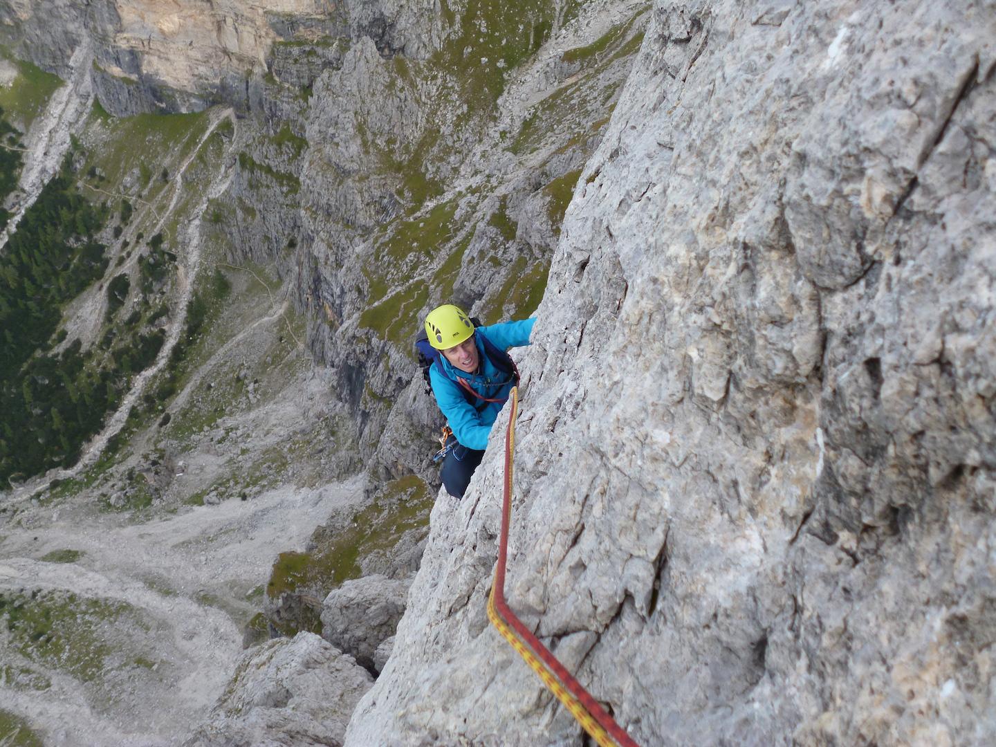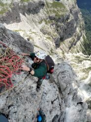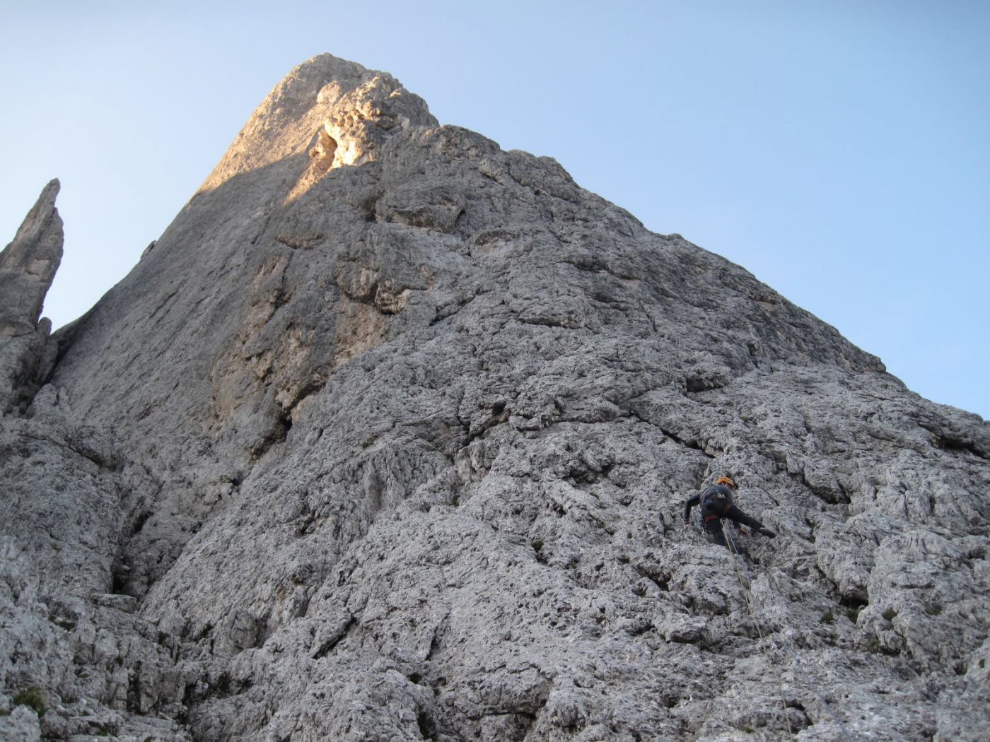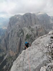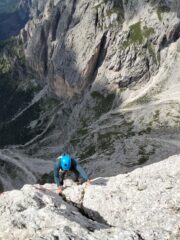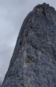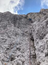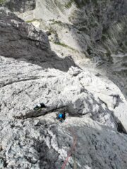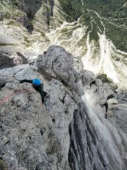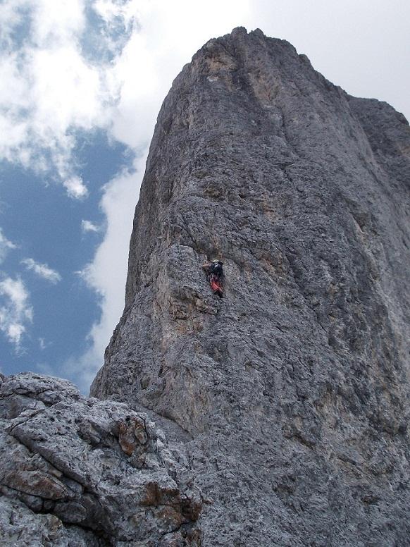 - Si rimane sullo spigolo fino al famoso passaggio in spaccata, salendo poi un’esile fessurina verso sinistra V, V+ (chiodi vecchi, 30 mt in tutto). Roccia bella ed esposizione continua.