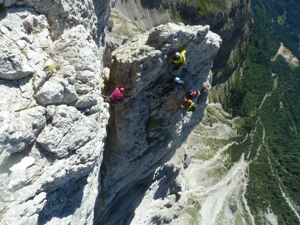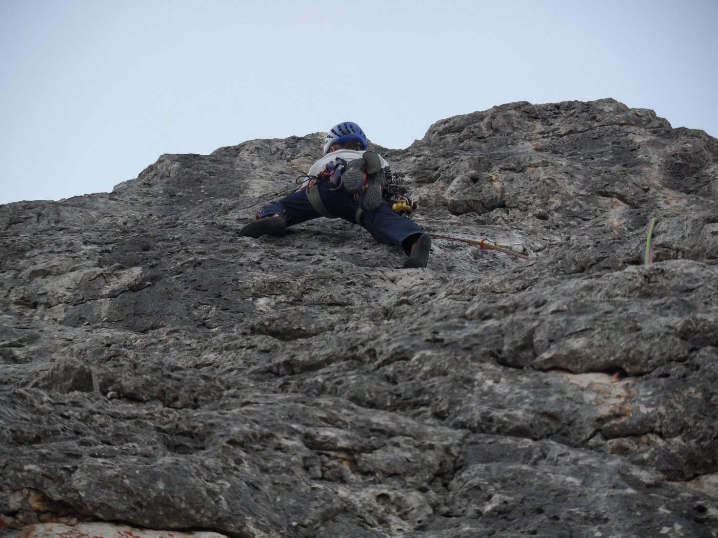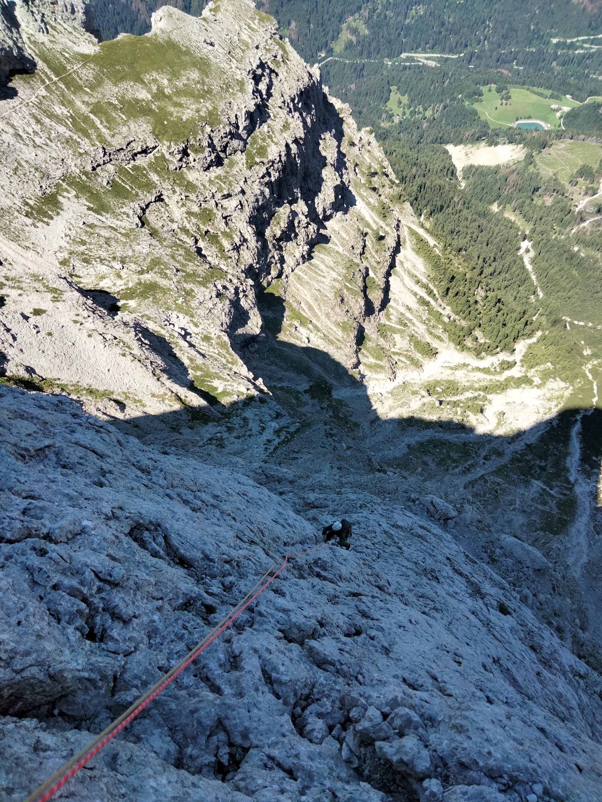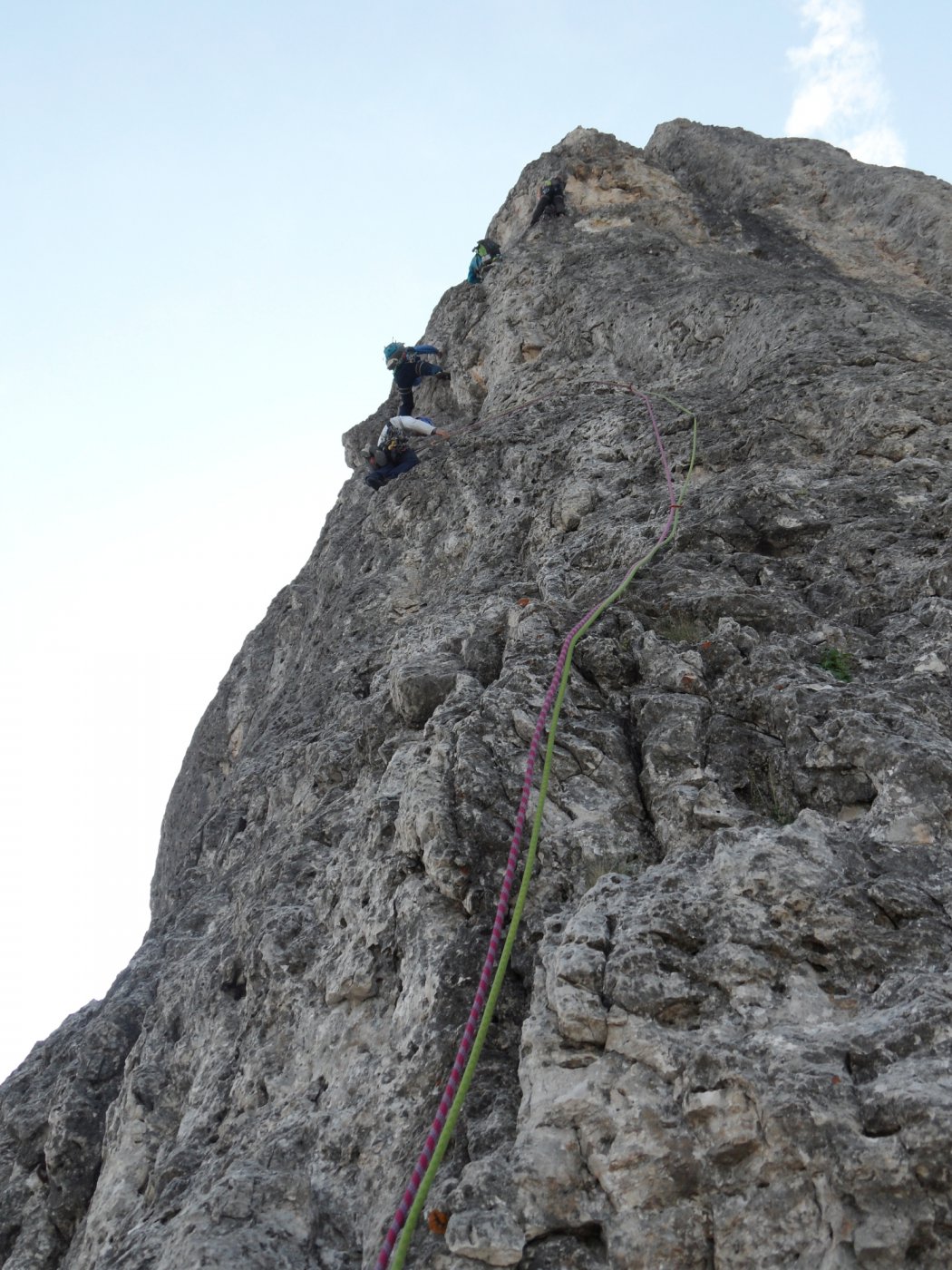 - Si rimane sullo spigolo fino al famoso passaggio in spaccata, salendo poi un’esile fessurina verso sinistra V, V+ (chiodi vecchi, 30 mt in tutto). Roccia bella ed esposizione continua.