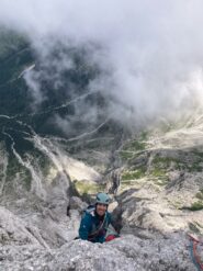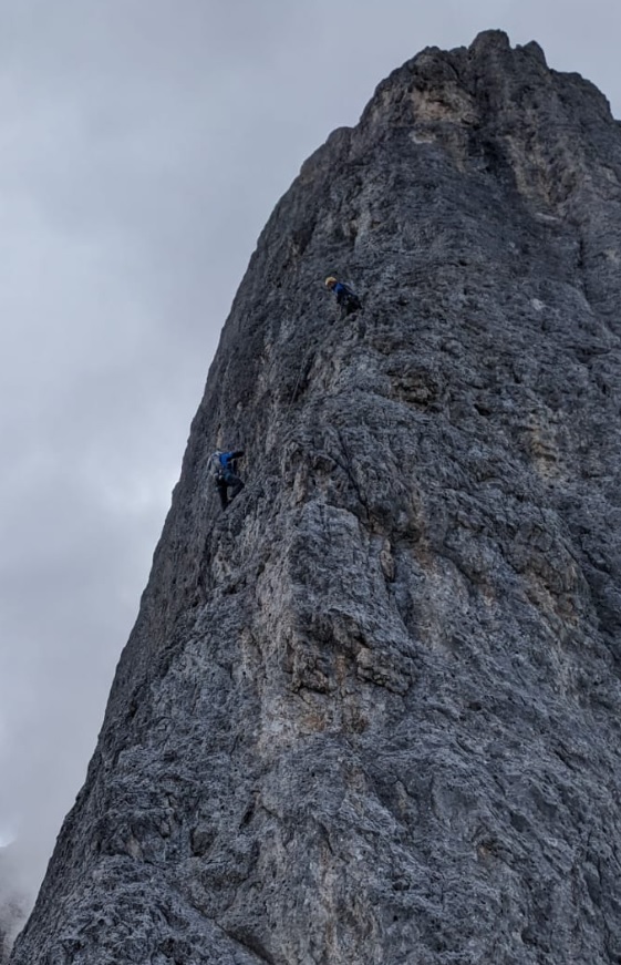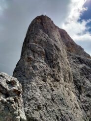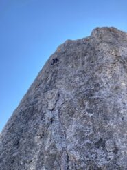 - Si segue una fessura che poi si trasforma in camino uscendo sulla destra (III+, IV-). Con facile arrampicata si arriva in cima al pilastro dal quale in 10 minuti di camminata in conserva su cresta si arriva finalmente in cima.